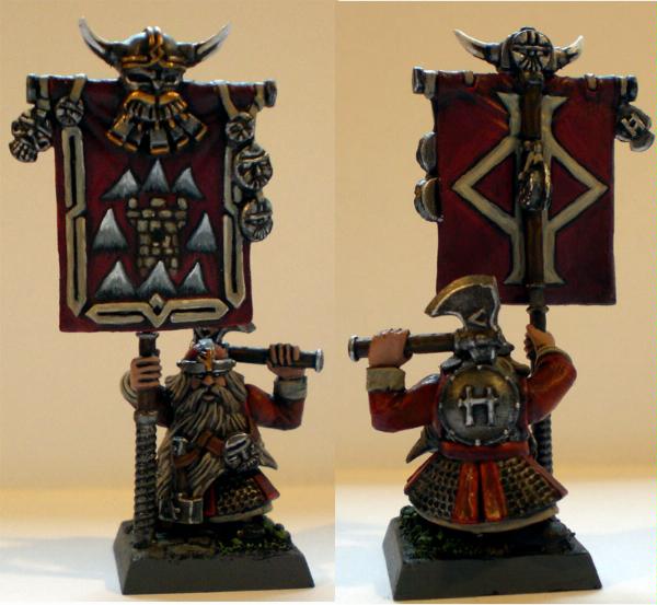 The standard bearer is inspired by Doug Braun's Longbeards (First place at the 2005 Chicago Golden Daemon). I loved the design and wanted to have a crack at recreating something like it. This is the largest and most complex freehand work I've ever done and I'm quite proud of it! I also drew a modified "Rune of Penetrating" on the back of the banner as a kind of inspiration for the rest of the quarreler unit (and to distinguish that unit from any other Quarreler units I'll be fielding). I've been using gold very sparingly in my dwarves so far and the banners was an oppertunity to stop being so sparing. I figure the standards are ancient heirlooms, brimming with power and extremely valuable.