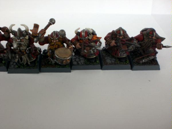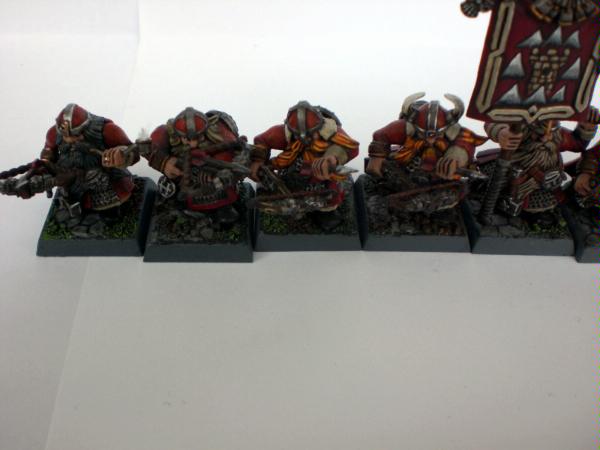 Very nice job. I continue to be impressed by your work. I love your freehand, and it's getting better with every model you paint. The basing is simple and fitting, with colors that suit the models. I really like the red you have chosen as your theme color, and the colors you use to supplement it are excellent. I'm very glad you chose to have the beards different. It brings a lot more life to the units, and makes them much more interesting to look at.
