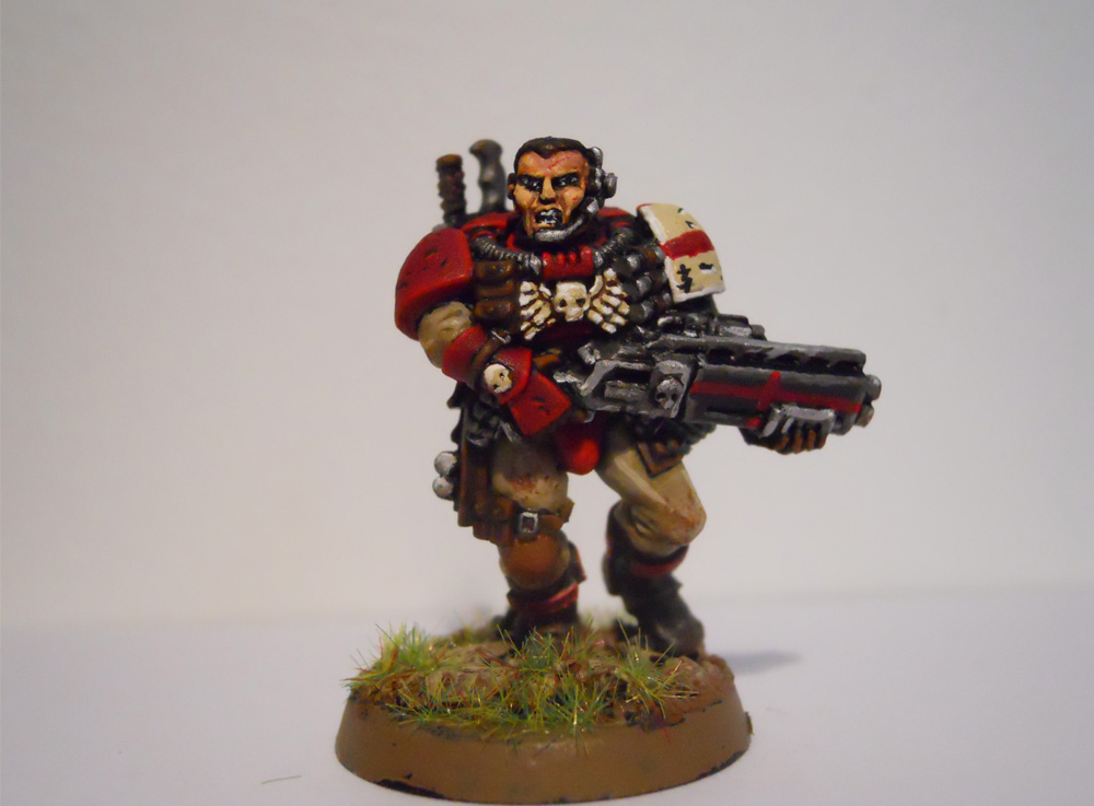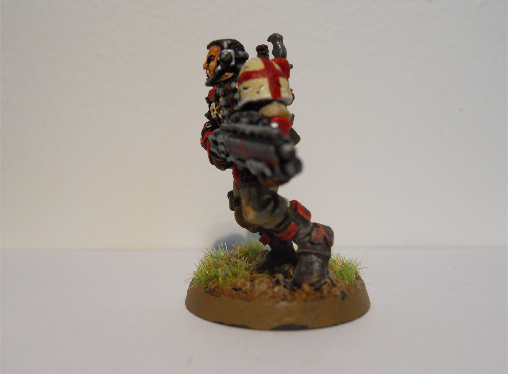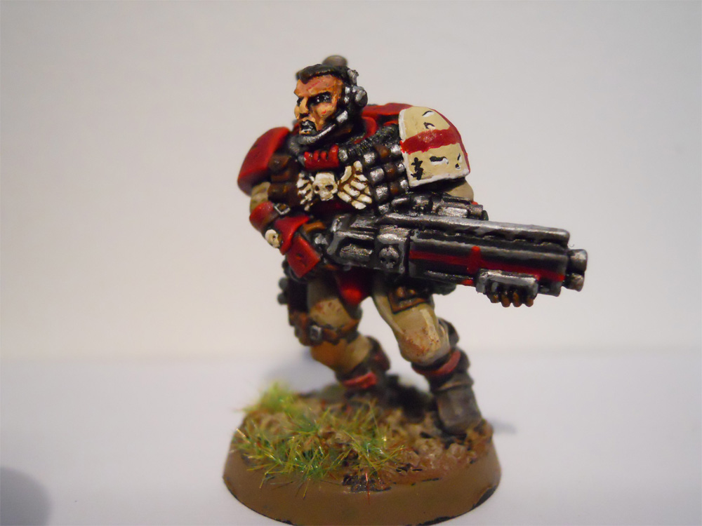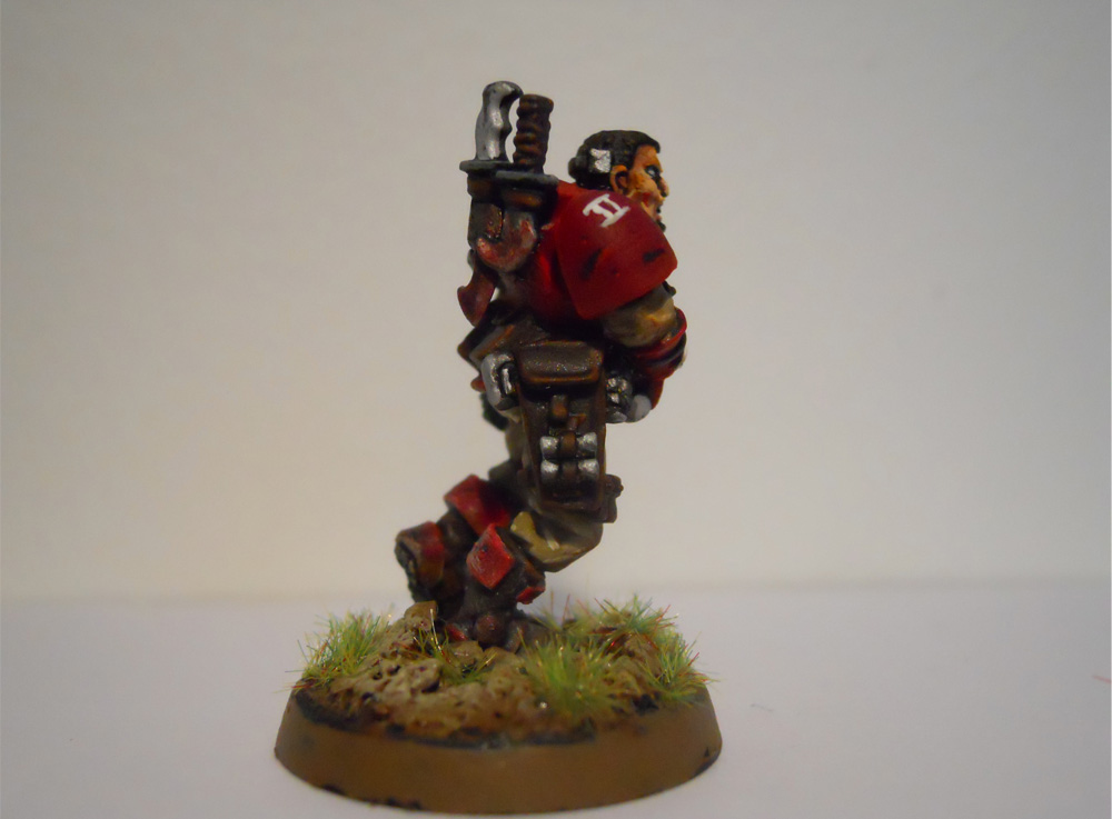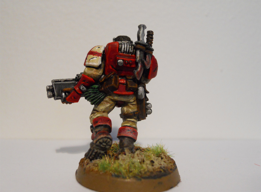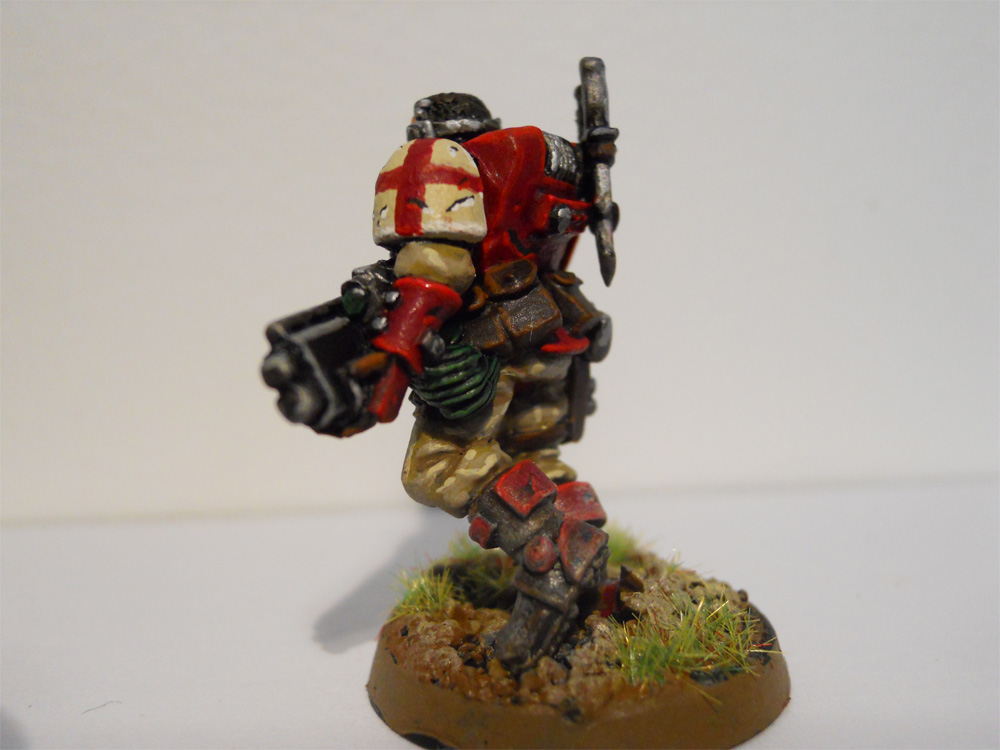 My objective for this guy was to make him look like he was in the middle of a war. First time I tried doing any of that "chipped paint" look, and I'm curious as to what you guys think of it. I also figured that he'd be crouched on one knee a lot, so I muddied his right knee.