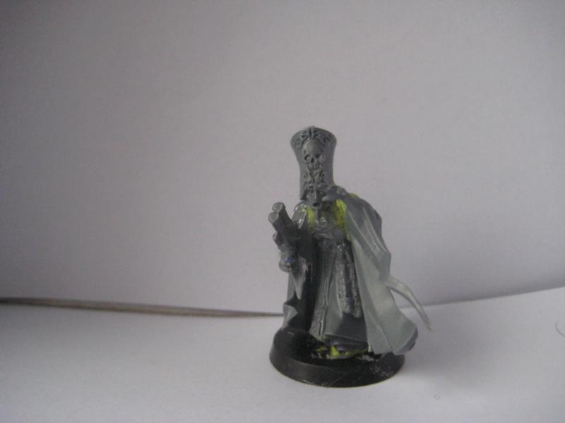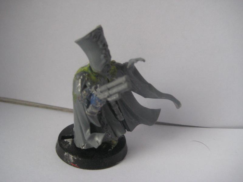 Hey all! Yep that's right thanks to my iniability to stay on one project for more than 5 seconds I've moved on. This is a =I= priest armed with a revolver. I made him out the Empire Wizard set and a revolver from BfSP. The revolver is held in what is like a bionic hand(a Fantasy skeleton hand) and the other hand is outstretched like he is looking through the veil. The yellow and blue goo, is from GS, once it is removed the model will look a lot better. I finding they work well as tempory dry fit holders. He is still very WIP, I still need to add purity seals and the like, I hope you like him. Questions and comments appreciated. Cheers, BT.