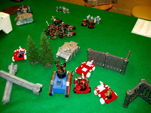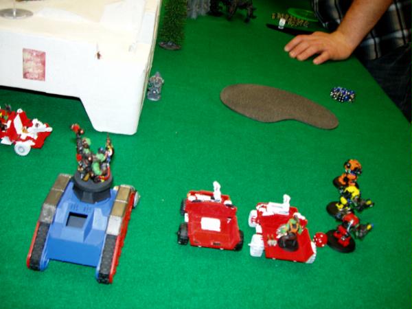 My Battlewagon (looted Russ) is not destroyed; it’s climbing over the wrecked Rhino! The 14 Burnas and Big Mek with burna in the BW hit 4 Termies and wound 30 times, he loses 2 after he wiped out most of my Bikes on his previous turn. I missed that picture, sorry. Unfortunately now my Biker Boss with all his wounds remaining is stuck with my retreating Biker Nob who can’t regroup!!!