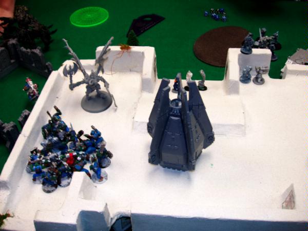 Jake drops a pod directly on the building, another pod right in front of my Boyz and proceeds to move up his speeder. His Rhinos move a little and their Marines all burst out and combat squad.