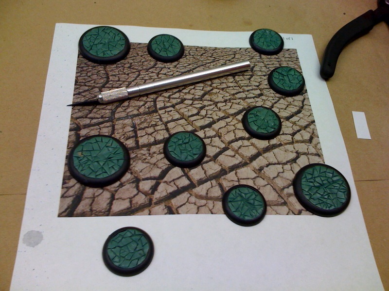 Next i had to decide how i wanted to base them. Previously i had made wooden bases for a friend and really liked how they turned out. I didn't want to copy it, but i did want something that was different than my usual three flocks and sand bases. Looking around on the PP forums i saw some one mention Cracked earth and decided thats what i wanted. I researched a picture on line and then printed it out, mixed up some green stuff and went to work copying it.