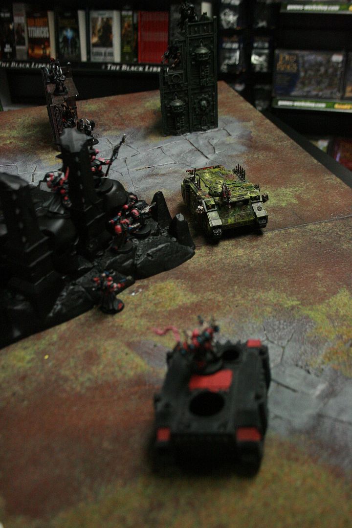 DP and move my one noise marine squad forward in there rhino, leaving the other on the objective. the unit on the objective's rhino moves forward a little in case support is needed. the chosen move through the cover towards the