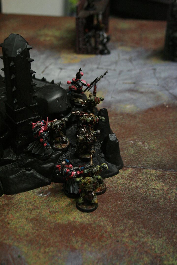 shooting, angry at the chosen destroying there slimewaggon the plaguemarines fire back causing no damage. followed by a volley of shots from the black legion causing 3 wounds and killing 2 chosen :(