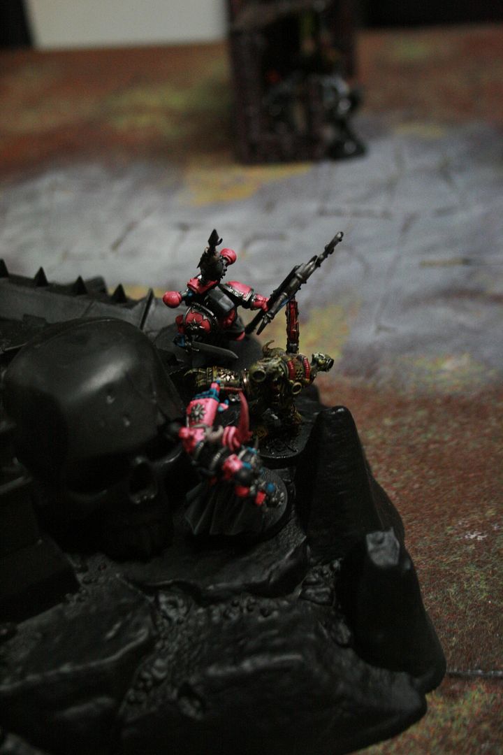 the oblits repositon themselves out of line of site for the blasmaster across the board while the deamons move in on the rhino carrying noise marines