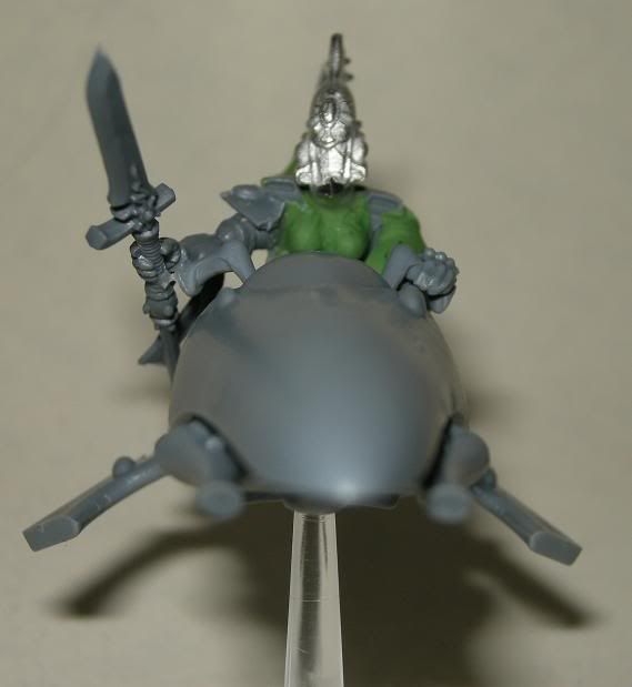 Long, flowing robes on a jetbike are just asking for trouble - so I gave her an alien version of a cavalry pelisse. I used a Farseer head, half a Dire Avenger torso (the back half), Guardian legs and left arm and a Dire Avenger right arm. Her pelisse, bust, waist and bum are green stuff.