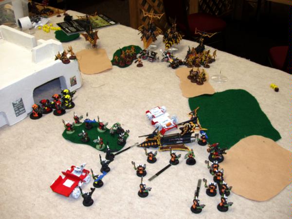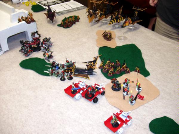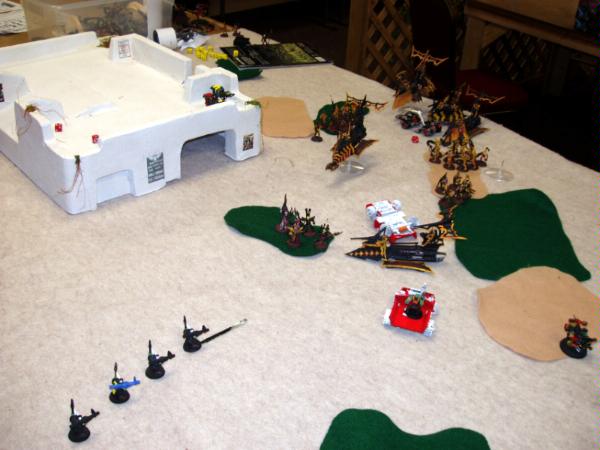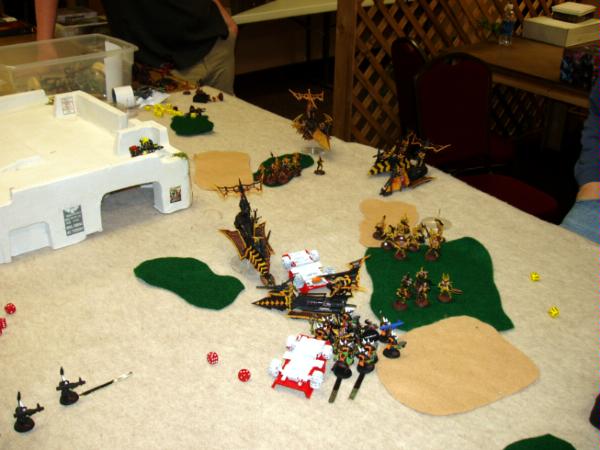 Archon and his boy toys assault Orange mob and will eventually lay waste. My Nobs are not rolling to hit or wound very well.