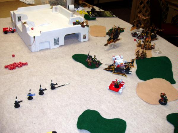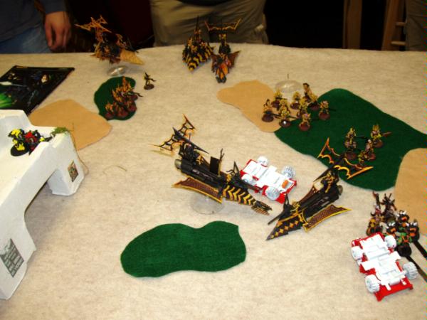 His Archon Raider flies over to the left away from the rest. His gunboats and/or warriors and/or raiders killed the Tankbustas borrowed Trukk and shot up the goo inside. It’s pretty irrelevant since all his squads have a Dark Lance if possible the 3 gun gunboats have the variable fire weapons. I love the idea of assault variable fire weapons. If I played Marines or Guard, I’d stock up on missile and grenade launchers for just that reason.