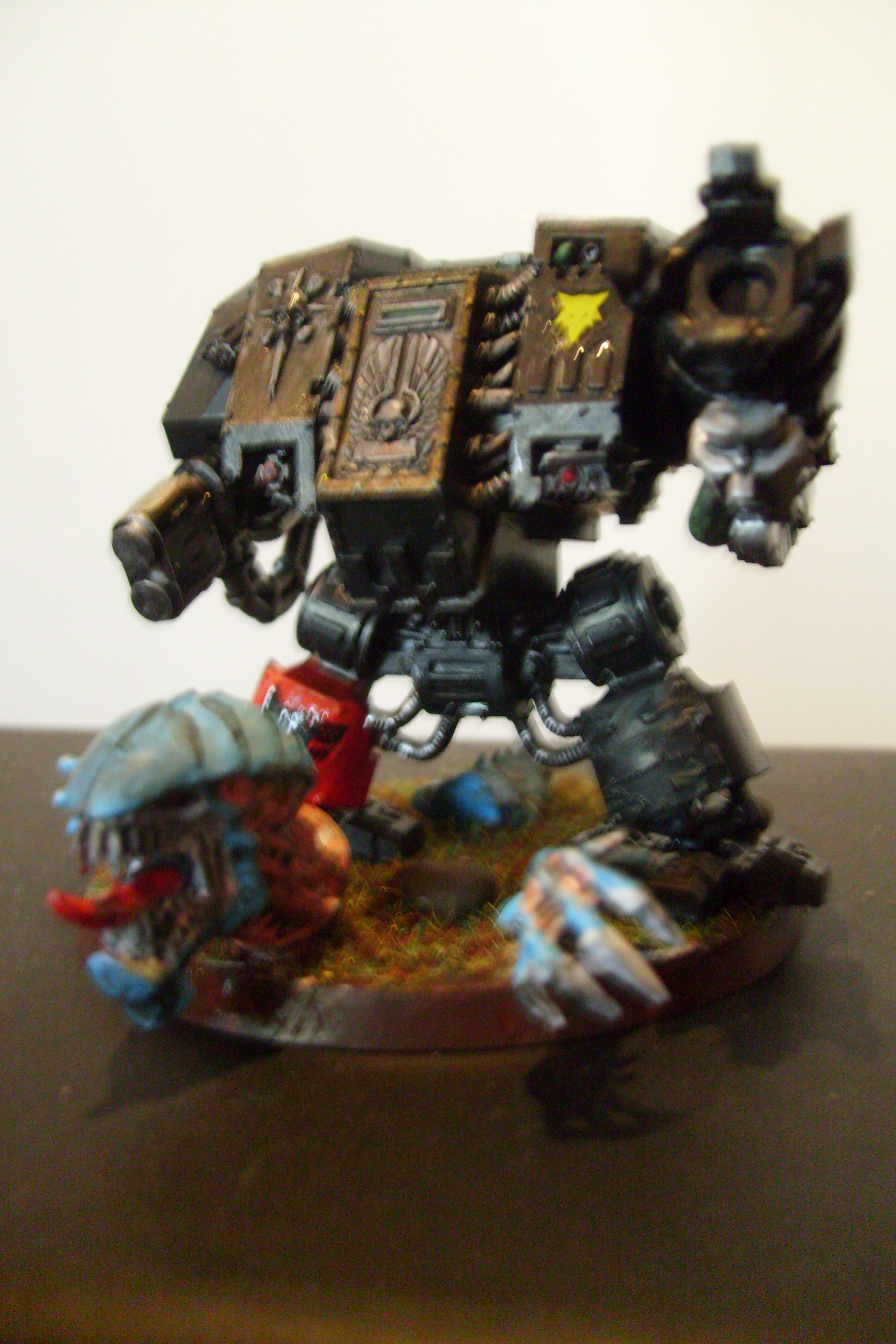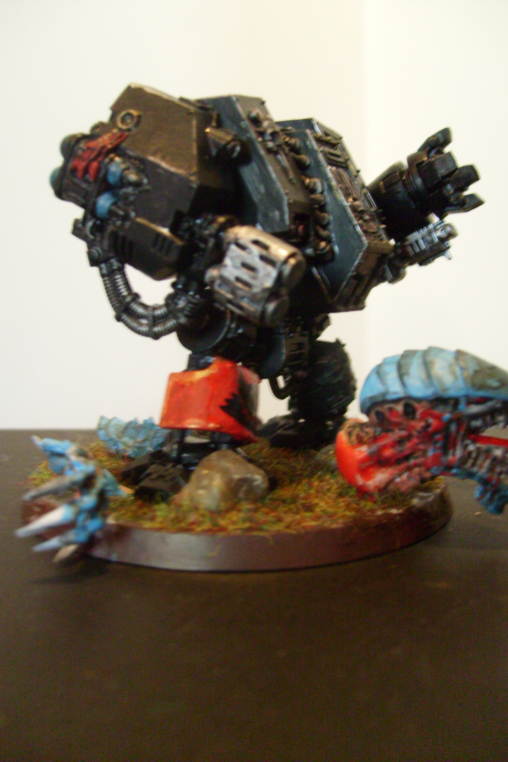 I know the dread legs aren't very poseable, but you can angle the feet a bit, and I think the pose will be more convincing if one foot is higher than the other, as if stomping down on the bug.