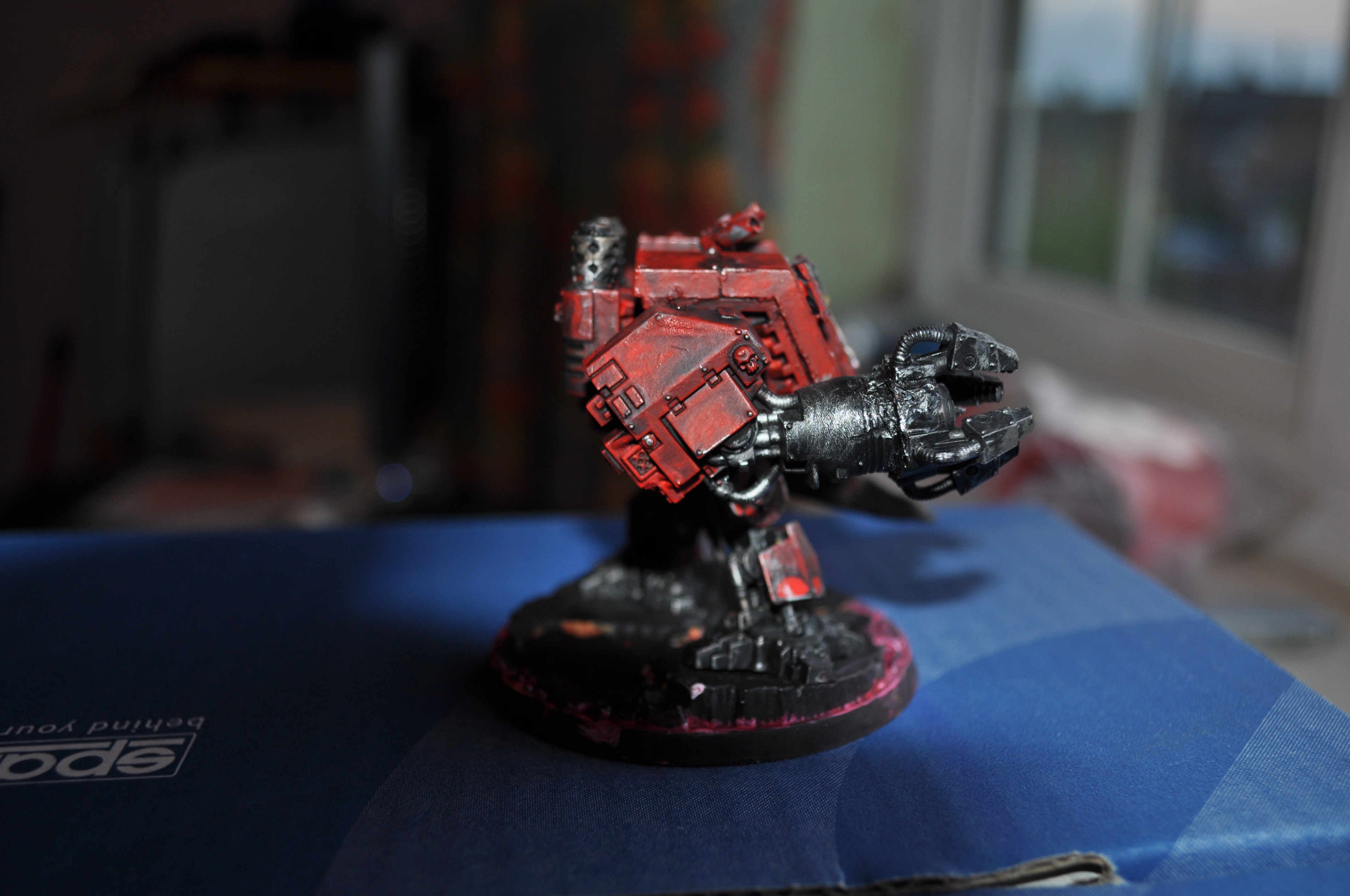 -Well I have Only Played Warhammer for 1 1/2 years, i "had" a badly painted Marine army and a chaos army, One Day I decided to repaint my Msrine army and I saw on the Internet (while looking for inspiration) the blood angels chapter, so I started painting, and when i was about 2 squads and a 2 hq's in, like magic, the codex came out (note: I was so eager i got the first copy in the shot, before they even went on the shelves) I'm currently working on a Furiso dreadnought librerian, and since it is going to be one of the biggest, baddest models in my army I wanted to really give it a paintjob to show,