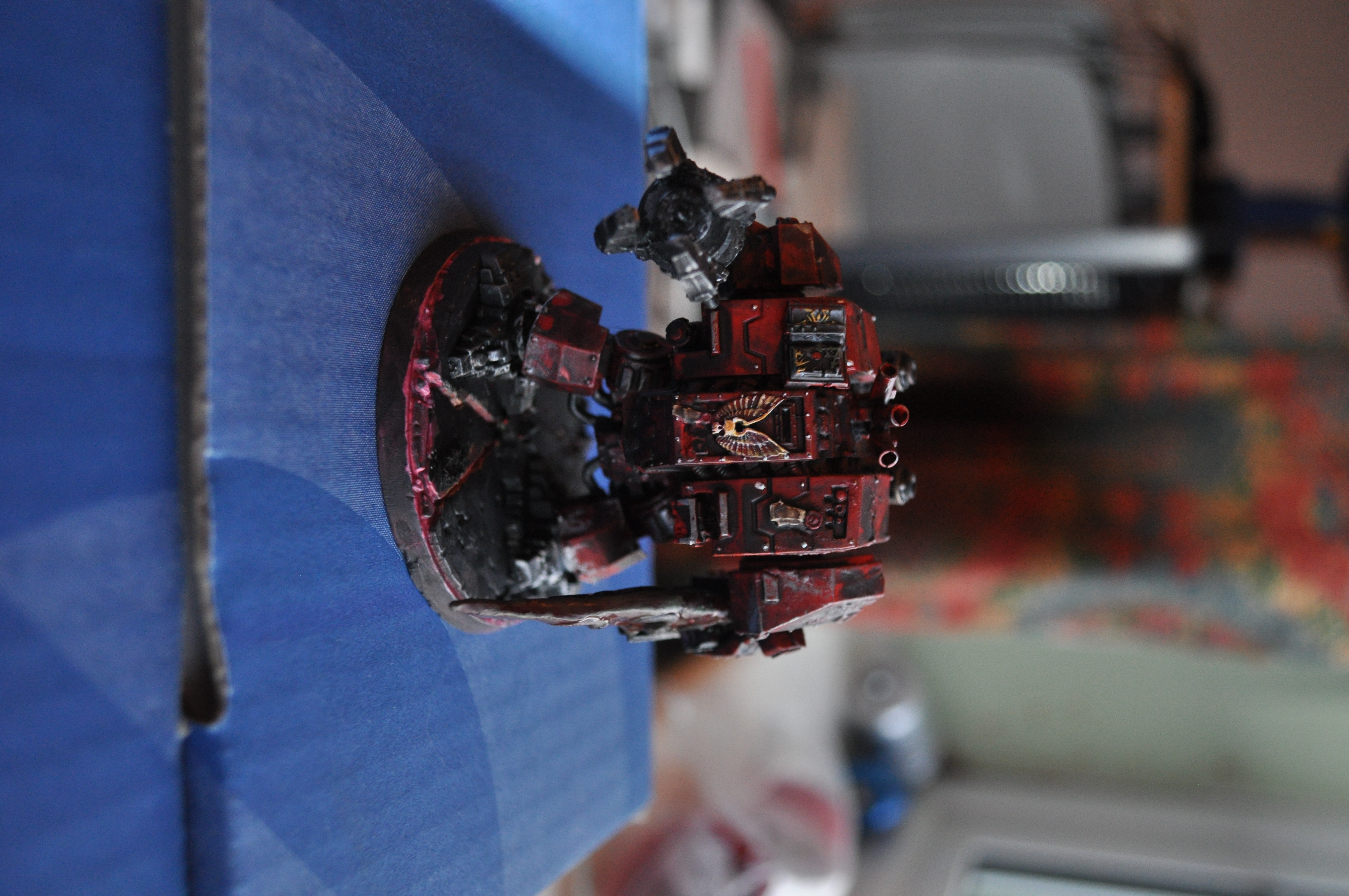 You wanted some tips on how I did the blood effect, well I just undercoated black, then a layer of mecrite red, blood red, then wash the whole model badab black, wash it really thick in places, to give it a burnt old kind of look, and then just spread around the thick bits of the wash around, the most important part of this is to wash the whole model, even the black bits, then lightly drybrush the area's where the paint would scratch off boltgun metal, with the screws and bolts, I used mithril silver (to paint a bit over the top of the round bit) I would usually highlight it blood red or red gore, but to keep with the really old effect I chose not to