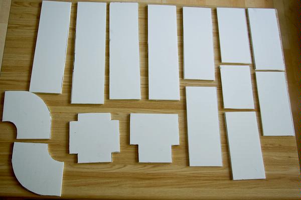 Yesterday while I was at the grocery store I found some sheets of foam-core in the school section. It was undamaged, and best of all, it had "ghosted" lines creating a grid of 1/2" squares all over it making it easy to measure out and cut everything straight with almost no effort. I cut that one sheet into a variety of interesting road shapes. At first I thought 1 sheet would not make very much road but was surprised once I started laying these out in different ways. This is plenty for my table.