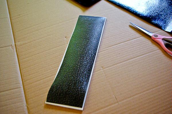 I then started cutting the strips into smaller, jagged pieces which I hot-glued to the foam-core road pieces: