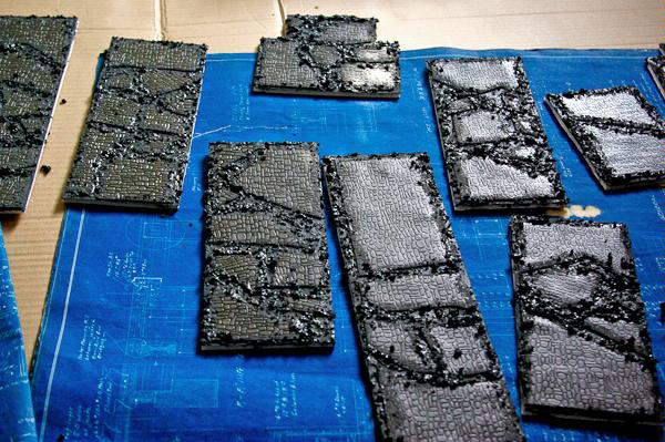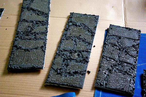 Then, using a mixture of gray paint, cat litter and water, I filled in the gaps between the cobblestone bits with it. Once these are dry I will start painting the streets. Everything is still downstairs drying right now. I should be able to post the final pics tomorrow.