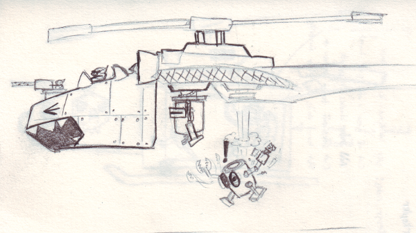 The raid on the depot was going well; at least Gobba Blaktoof thought so. He and his kommandoz had been given the task of sneaking into the encampment and sowing as much trouble as possible to distract da Oomies from the main attack. What could be better than starting the fight before everyone else? Of course, what they hadn't counted on was the automated sentry guns placed all over the place. Still. "Wot self respektin Kommando can't sneak dere way pas' a small ting like dat?"