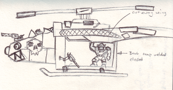 Nice scetches! If you want some inspiration I Think you should check out forgeworld, they have recently released an ork helikopter that transport boys!  Hope it can give y some ideas