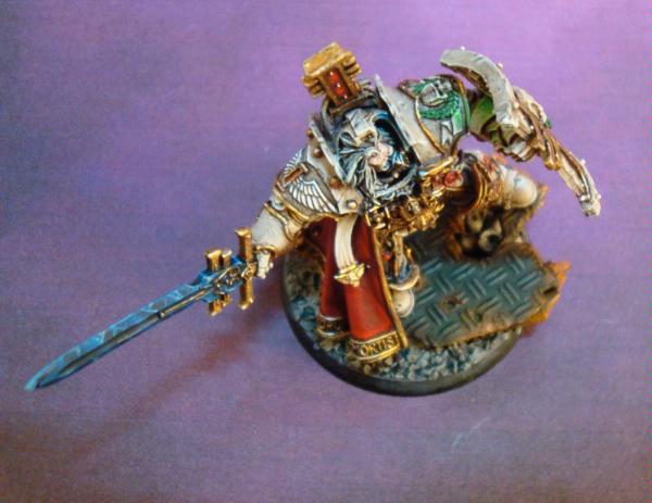 A quick way to do a frost style weapon is to paint the weapon regal blue. Then get some skull white, wipe the excess off thoroughly on some paper towel or something else slightly coarse, and then wipe it quickly across the blade at an angle - the bristles should have some gaps between the parts loaded with paint, causing a light effect across the blade, especially as the edge of the brush will have less paint.