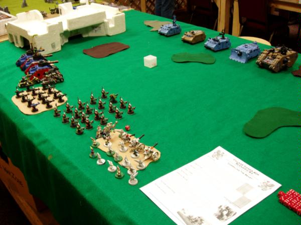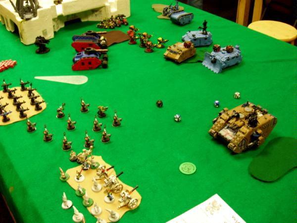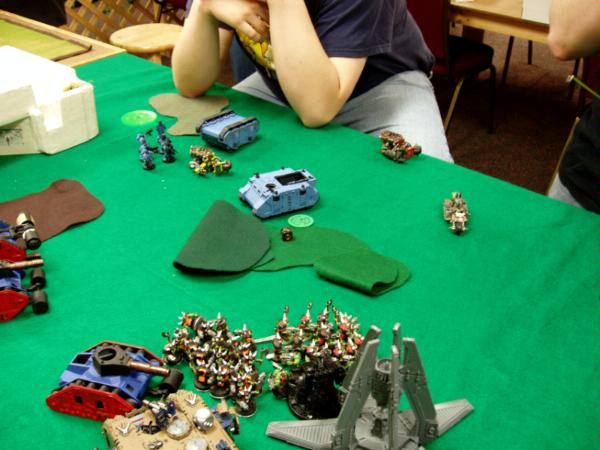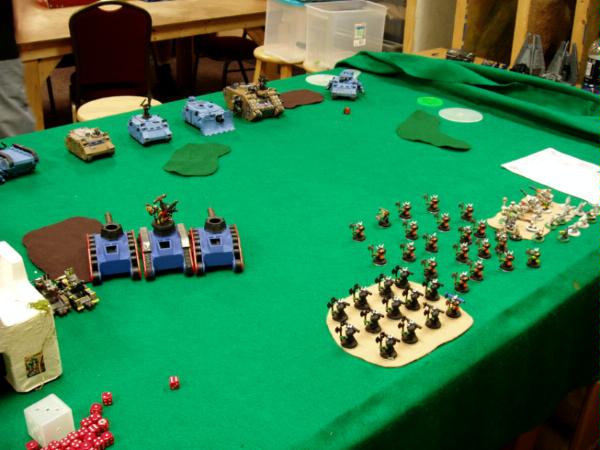 Most things are tied in combat and the Mobile Objective veers way left at the end of his turn. The only things within 12" are my Battlewagon 140pts to his 5 man wolf squad which is less than 140 points granting me a minor victory.