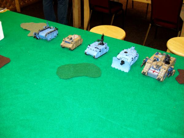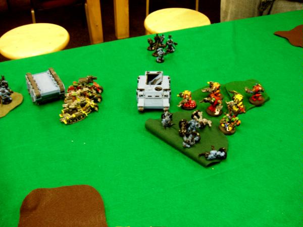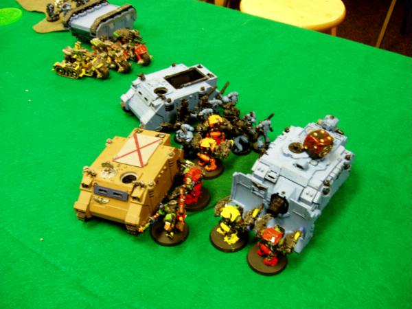 The Big Mek and Mega Nobz move out towards his Rhinos. Rokkit Trakks move up. Orange Boyz spead out. Here's after the movement phase.