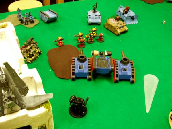 The Red Boyz jump out of their still-imobilized BW (it eventually self-repairs but I forget to move it for the rest of the game) looking for trouble. 2 of the Rokkit Trakks move and start firing on his Las Pred which is so far away it hasn't been in most pictures this game. Mega Nobz and