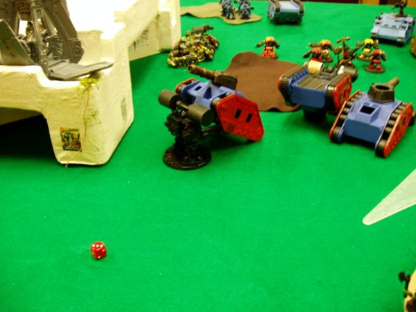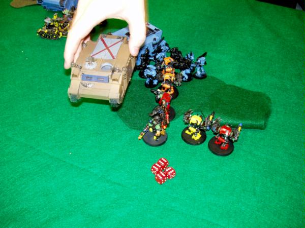 The Mega Nobz aren't able to pop the Rhino in front of them, Lootas glance the hell out of the Vindi again. Rokkit Trakks do little,