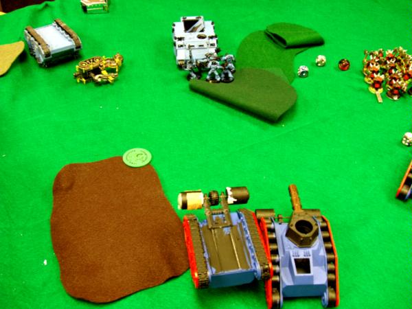 His Dred on terrain hops down to shoot a BW up the Poop Shute. His brown Rhino moves away from the Mega Nobz and