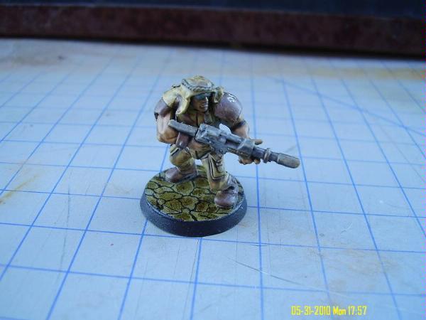 Airbushed Sand Yellow (Vallejo air) as a base coat. VMC Dark earth on the leather. VMC Light Grey on the rifle. VMC Medium flesh on the flesh.