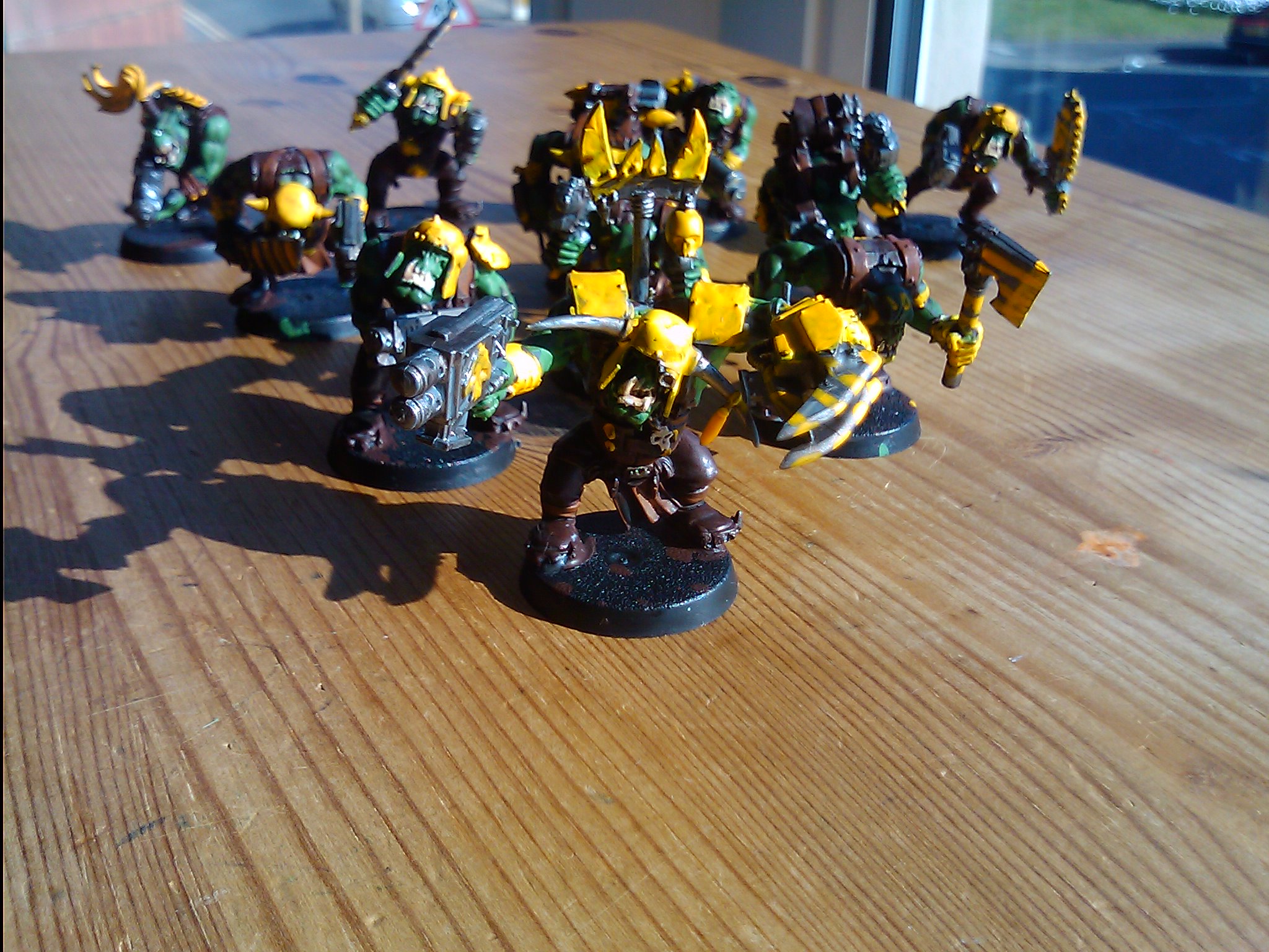 I really doubt a whole unit of orks is going to have brand new yellow painted gear.