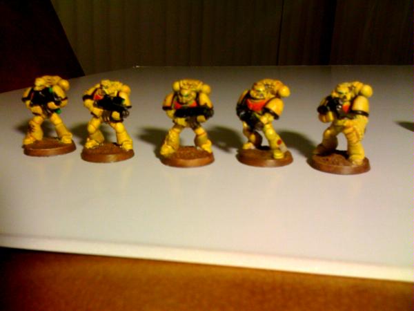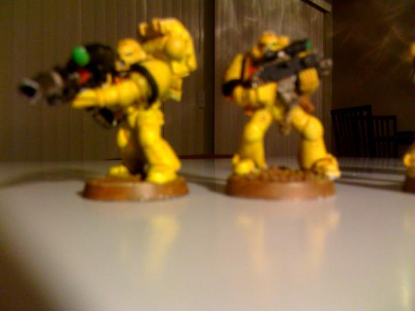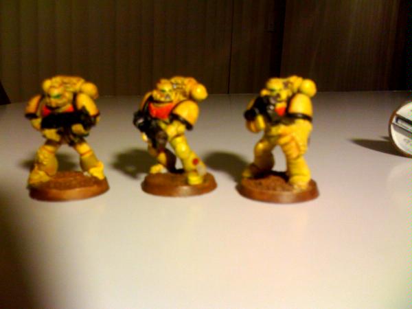 Doing another combat squad ATM. The yellow is finished and i'm working on the details. After that I'm going to paint up one more tactical so that I have all of my 2k troops painted. Then I'll move onto their rhinos.
