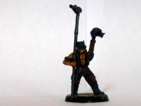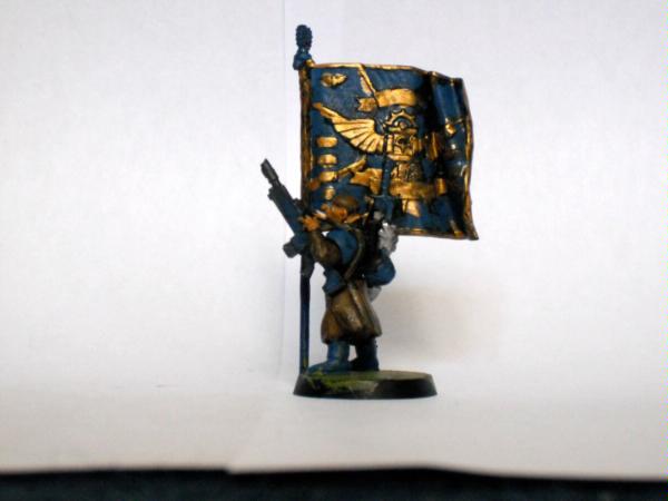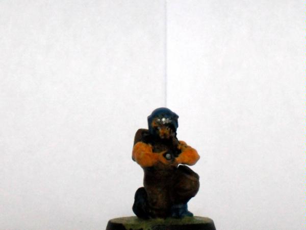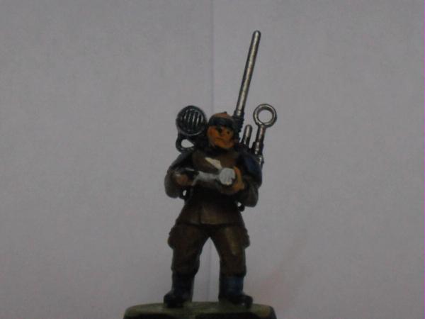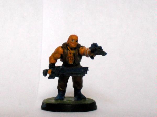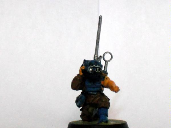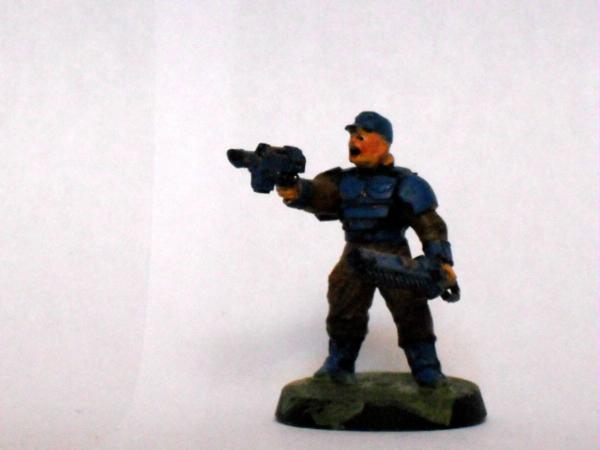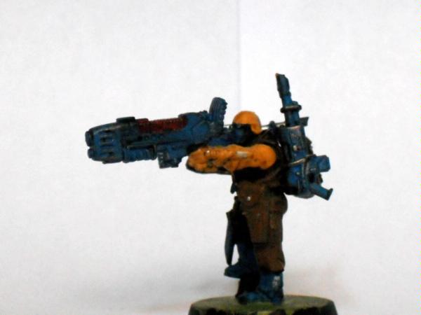 The master of the armoury. Spread over the model he has a plasma gun two lasguns two laspistols and a combat knife.