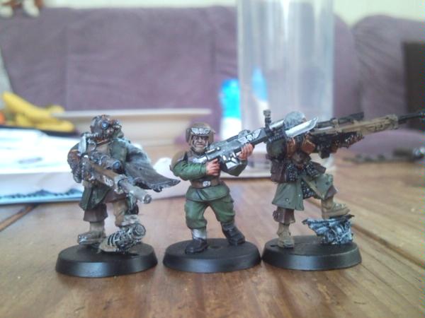 Well I spray paint mine khaki, then do the flesh in skin tones, and dab on bits of brown white and black for camo. Course my core regiment is Tallarn, and these come out nicely as modern desert camo troopers