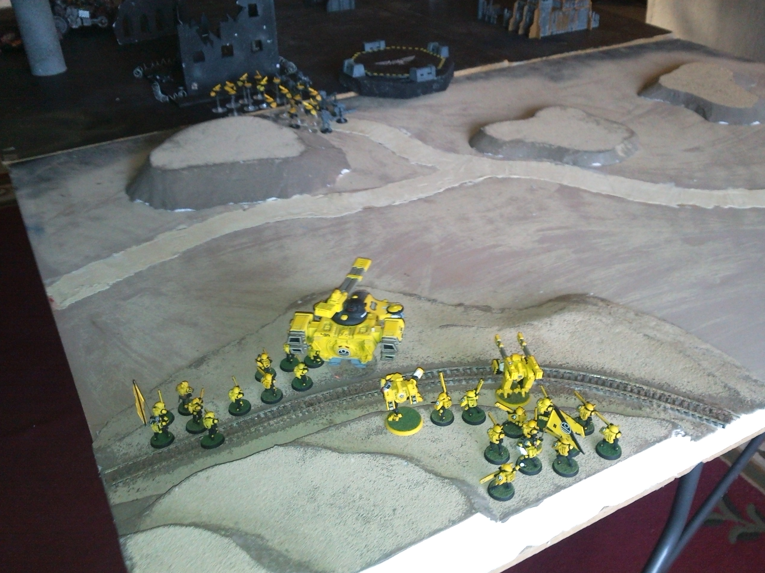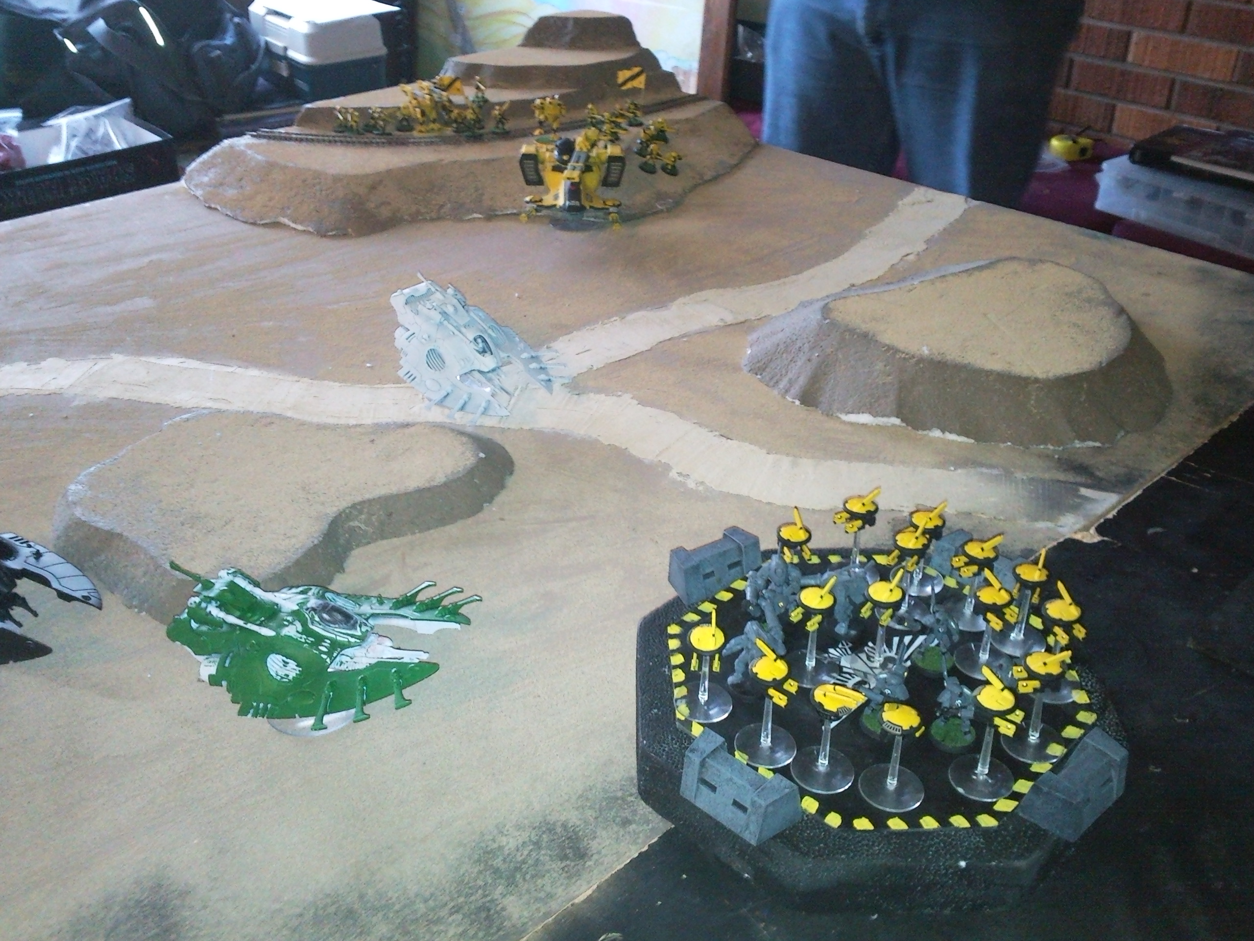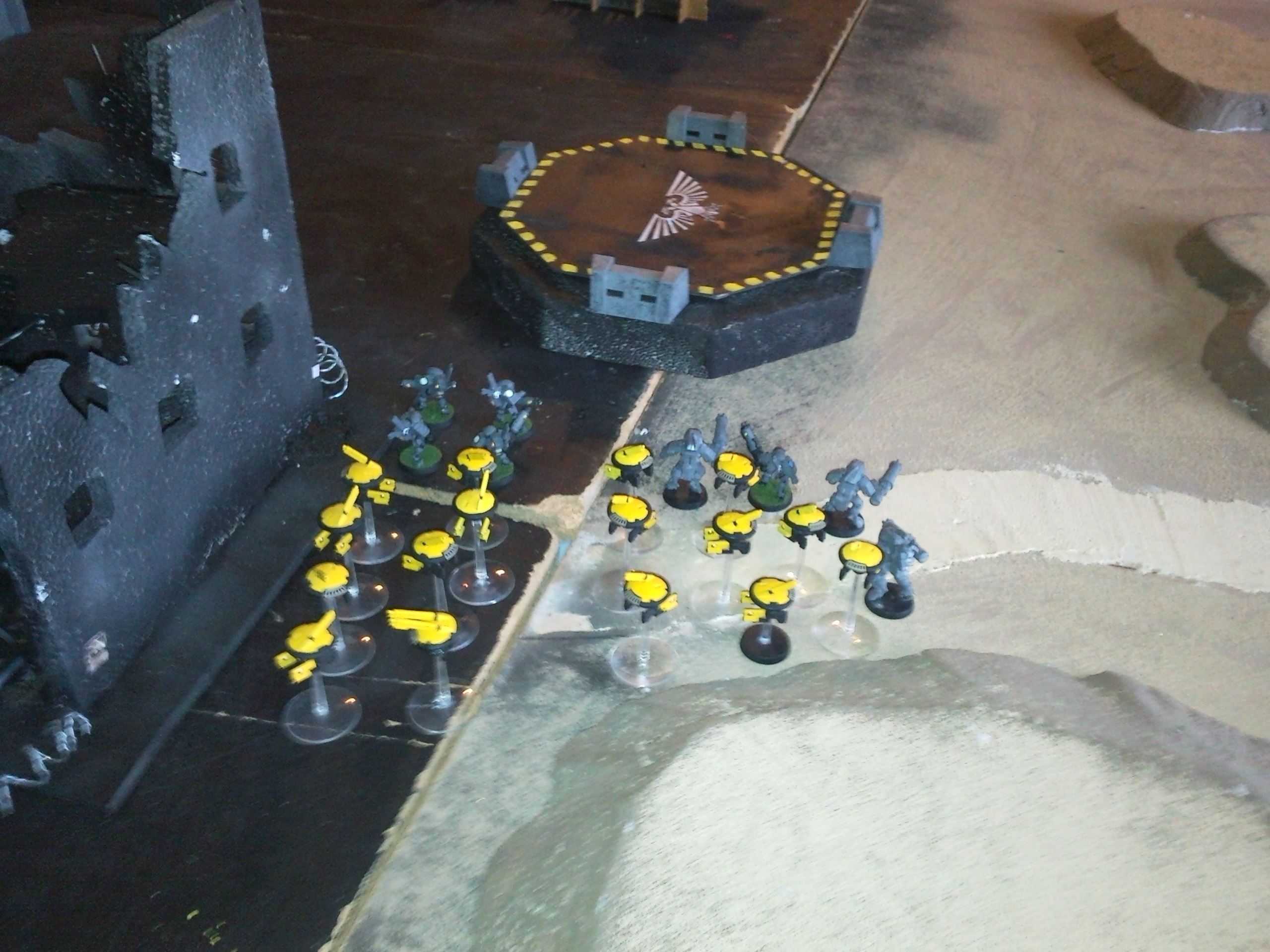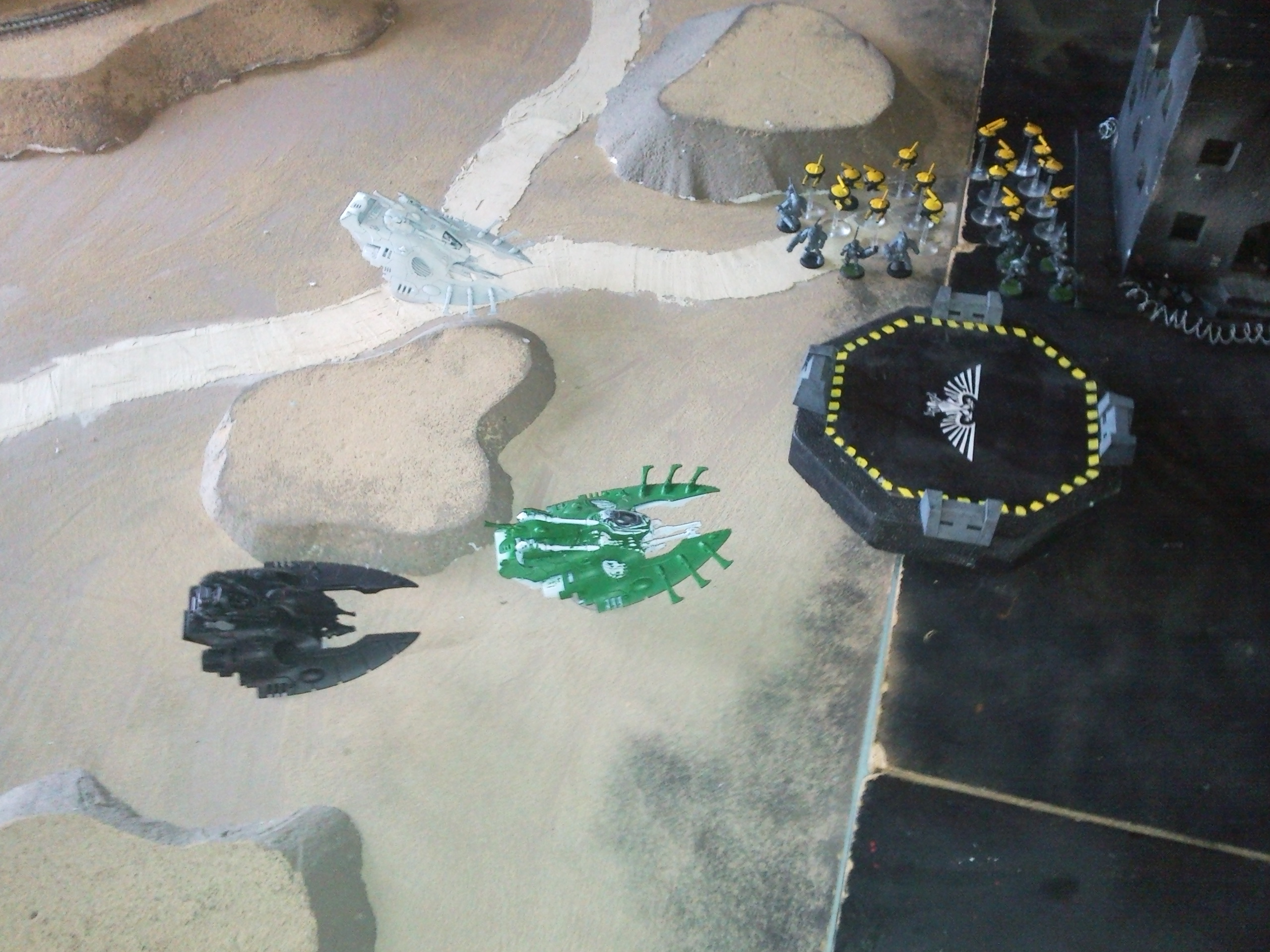 Tau - Having deployed his Stealthsuits near the landing pad the Tau begins the game capable of reaching the hulk at the beginning of his 2nd turn. He moves onto the landing pad and moves his firewarriors off the hill. He uses his broadside and hammerhead as fire support, but is unable to damage the advanced eldar vehicles.