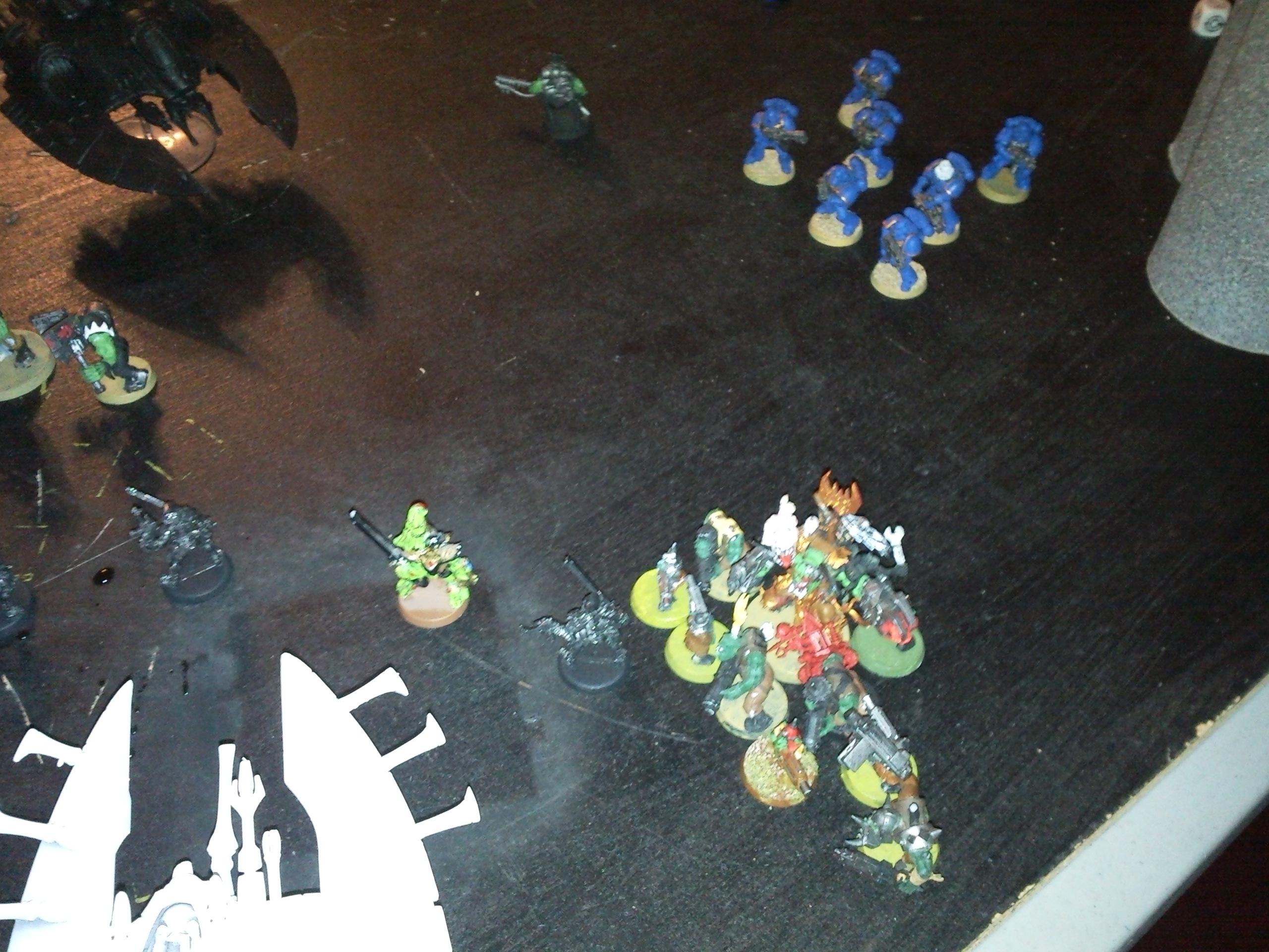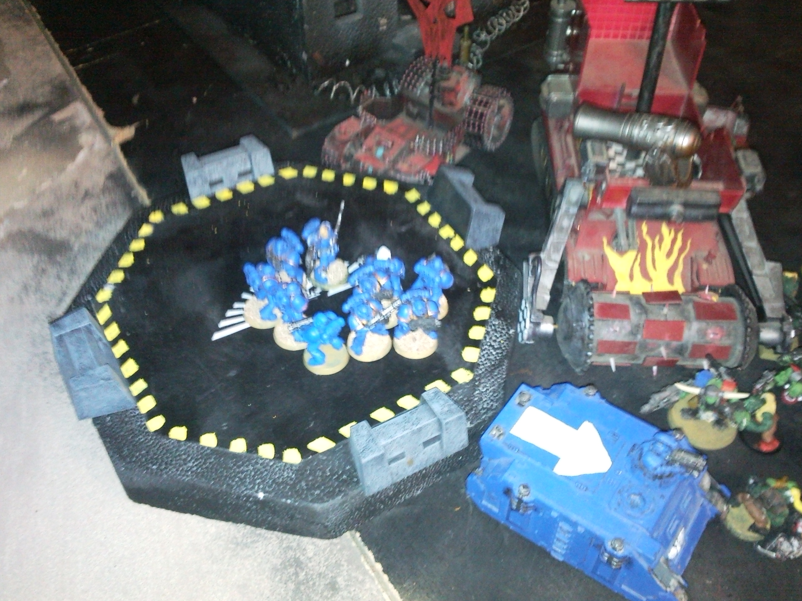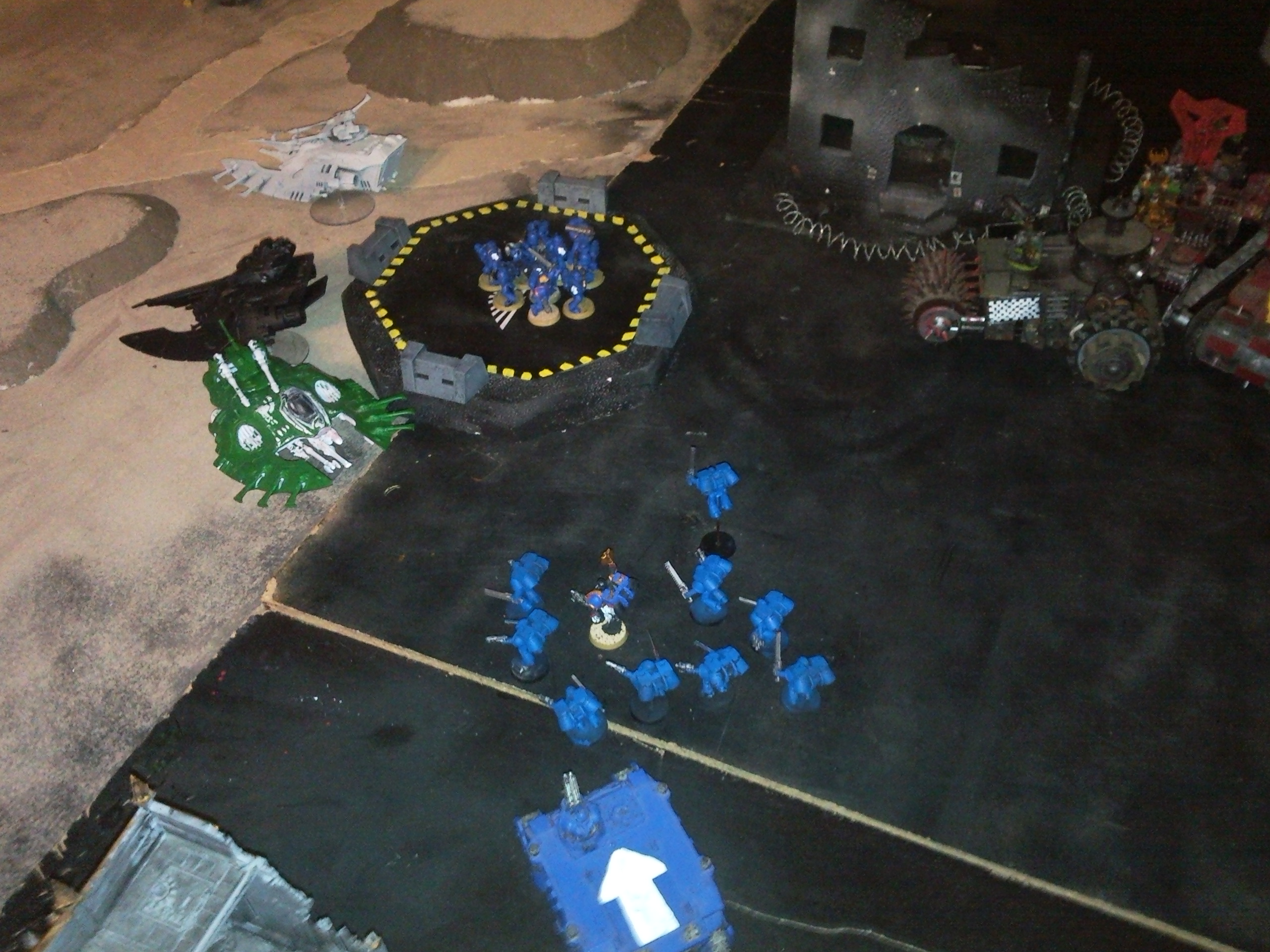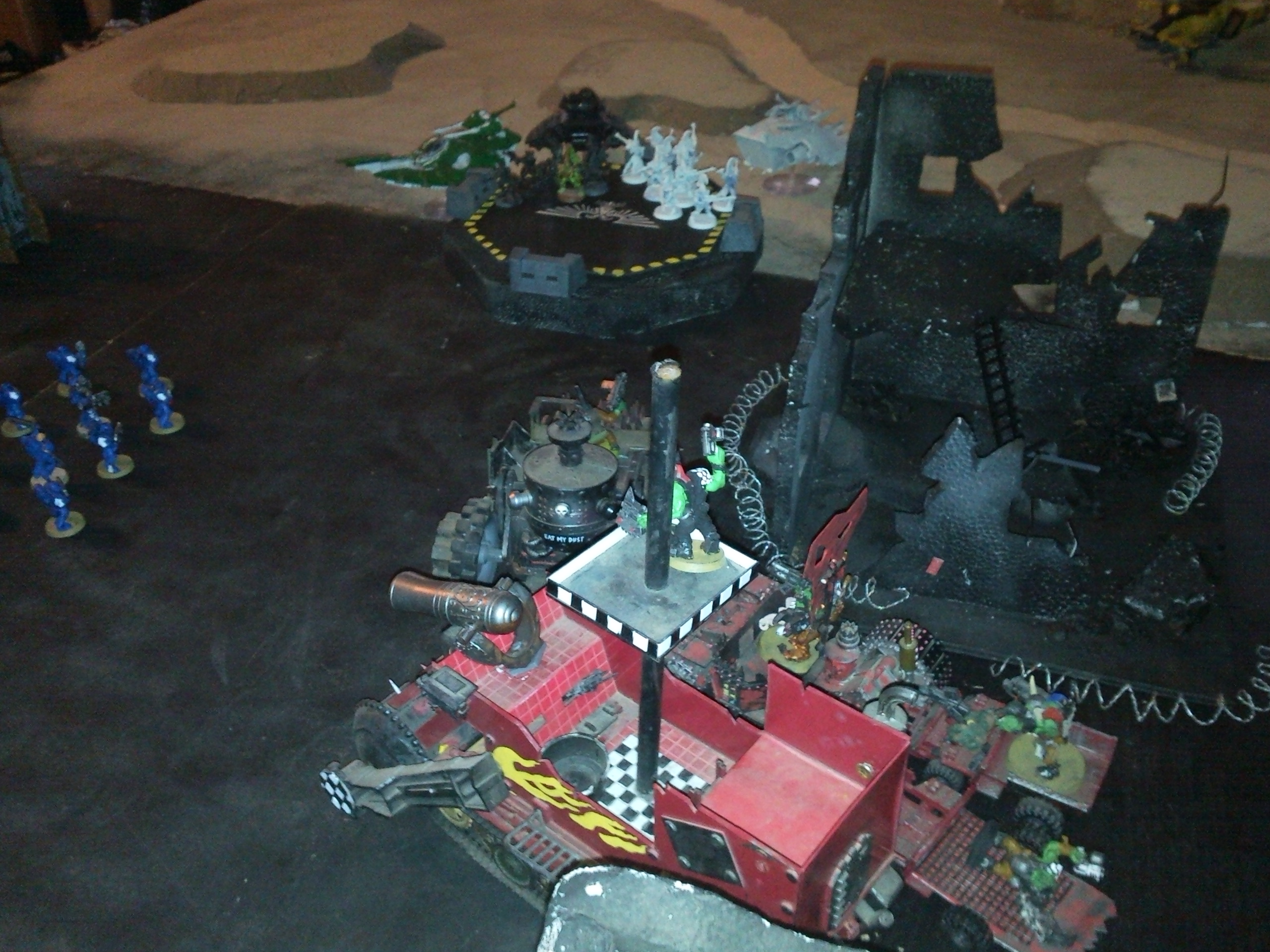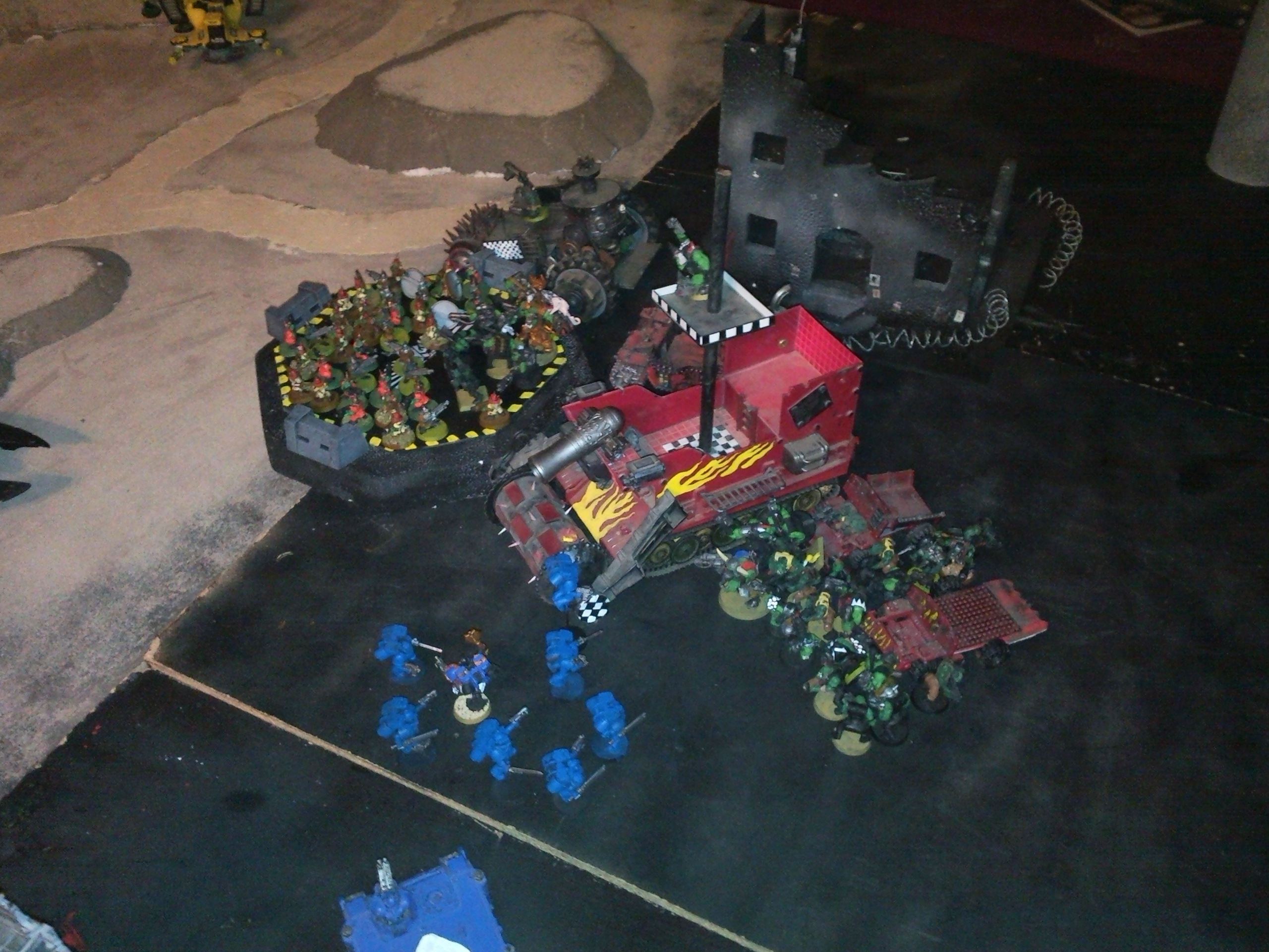 Orks: The orks finally made it to the landing pad and unloaded both trucks on the assault marines. They skipped shooting and went into the assault phase and killed all the marines and wounded the chaplain. The orks were able to unload the battlewagons on the landing pad. Two mobs of grots and the warboss with five burna boyz. They will be doing some damage on the hulk.