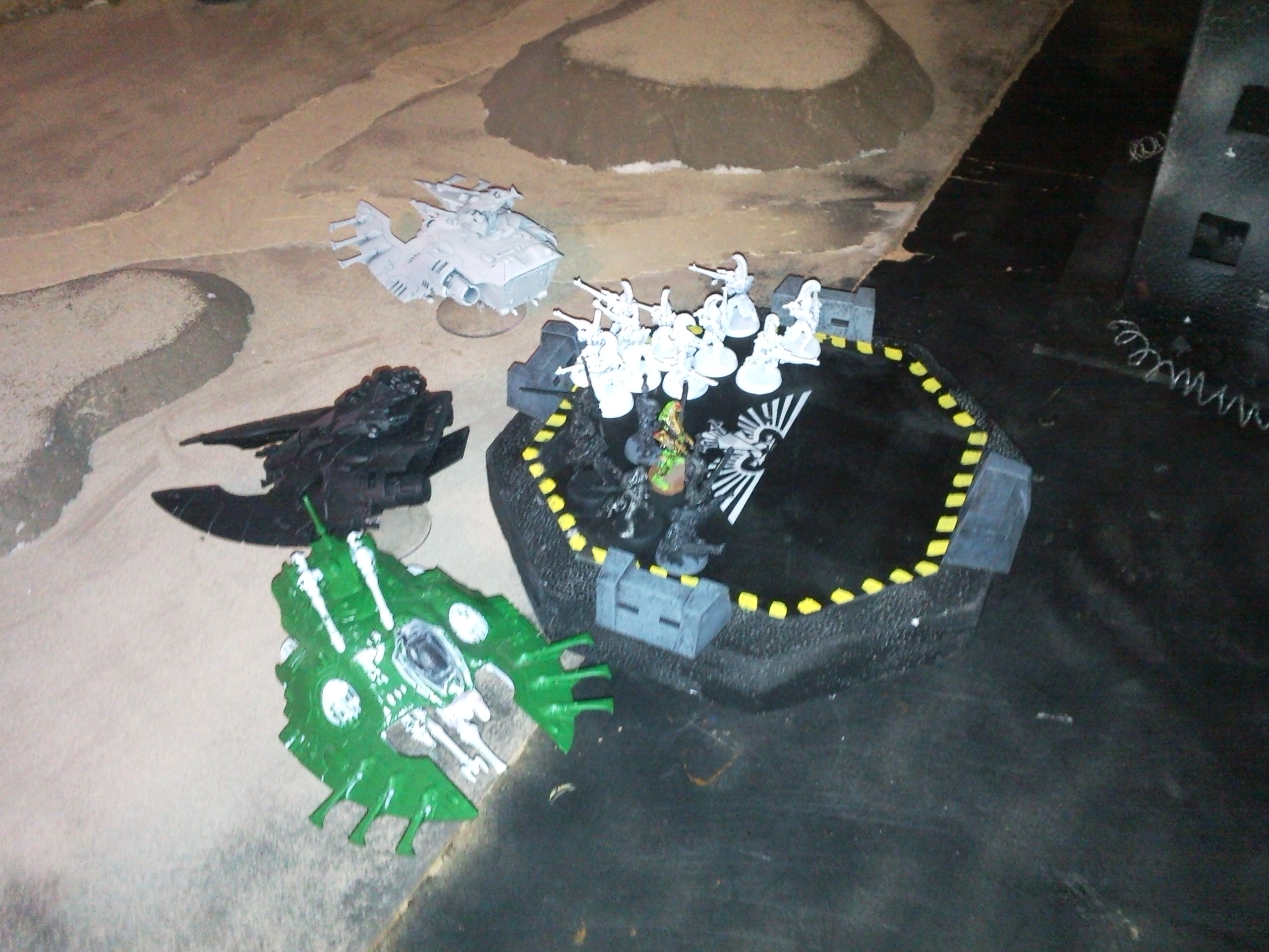 Eldar: The Eldar player drops off all of his Dire Avengers and Striking Scorpions onto the landing pad. The vehicles shoot at some of the units surrounding them and killed one space marine with a Bright Lance and shot at the Tau and missed.