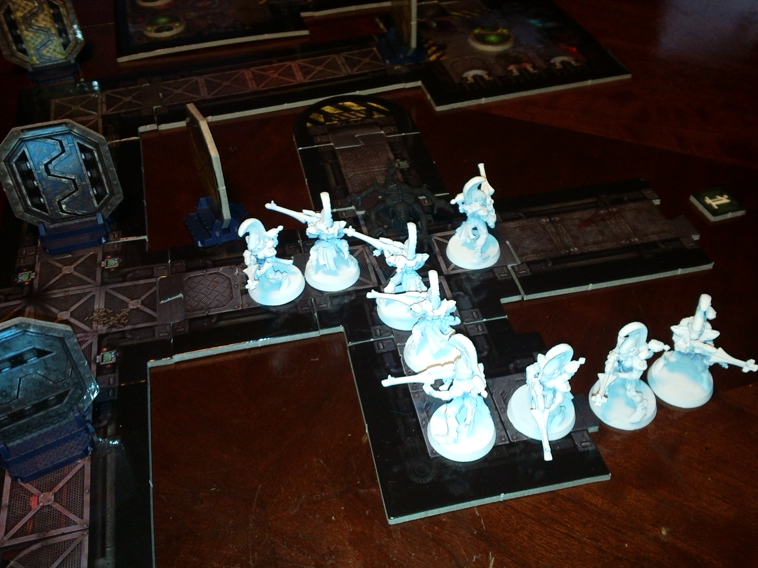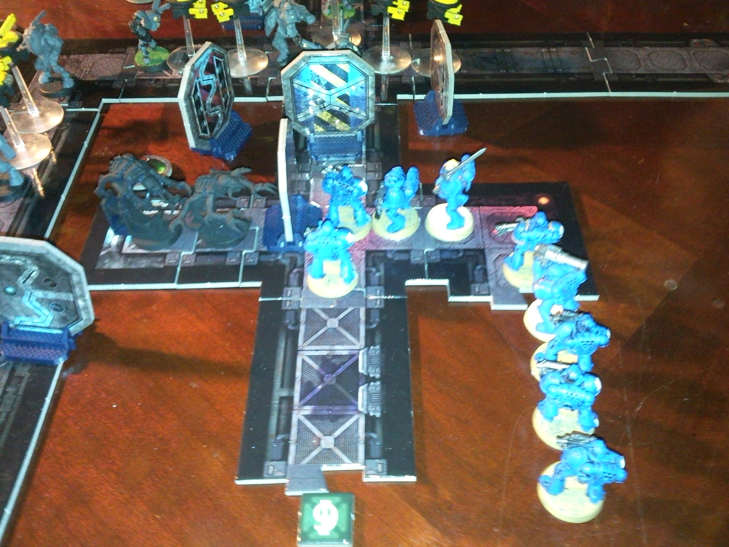 Ultramarines: The marines moved another tactical squad on the hulk and was unable to kill the one genestealer in its way. The other squad after losing their librarian in the prior turn, continued moving and flamed the hallway attempting to kill a gene and a stealsuit. They killed the gene but failed to kill the tau, sadly they lost a marine in the flames.