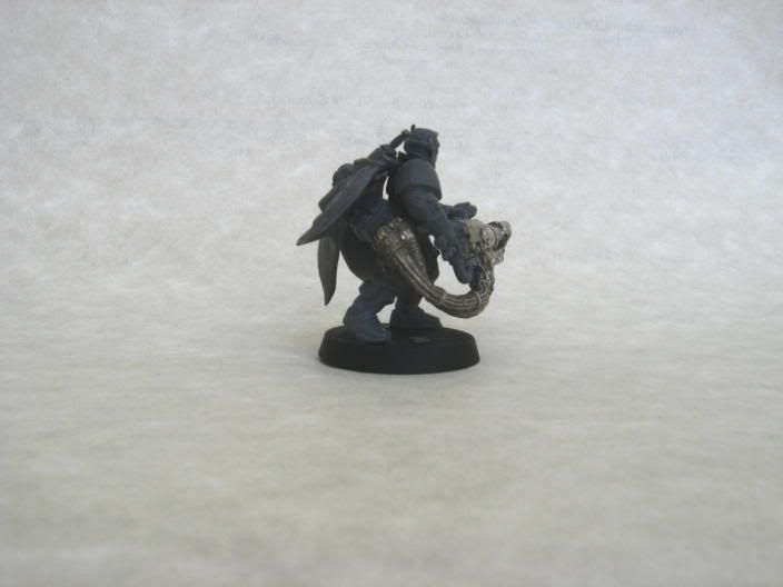 Finally, here is my "Try Again" Bragg, hefting a lascannon. You can see in the pic from the back how the lascannon power cables run to a pack hanging from his waist. Now, #1, I'm not sure if lascannons are all that for IG in 5E, and #2, I'm not thrilled with how the model turned out, but I can't put my finger on exactly what. I know that I don't like how the cloak falls, and I think part of my dislike of the model is how I had to reposition the right arm - suggestions from readers are definitely appreciated on this, though.