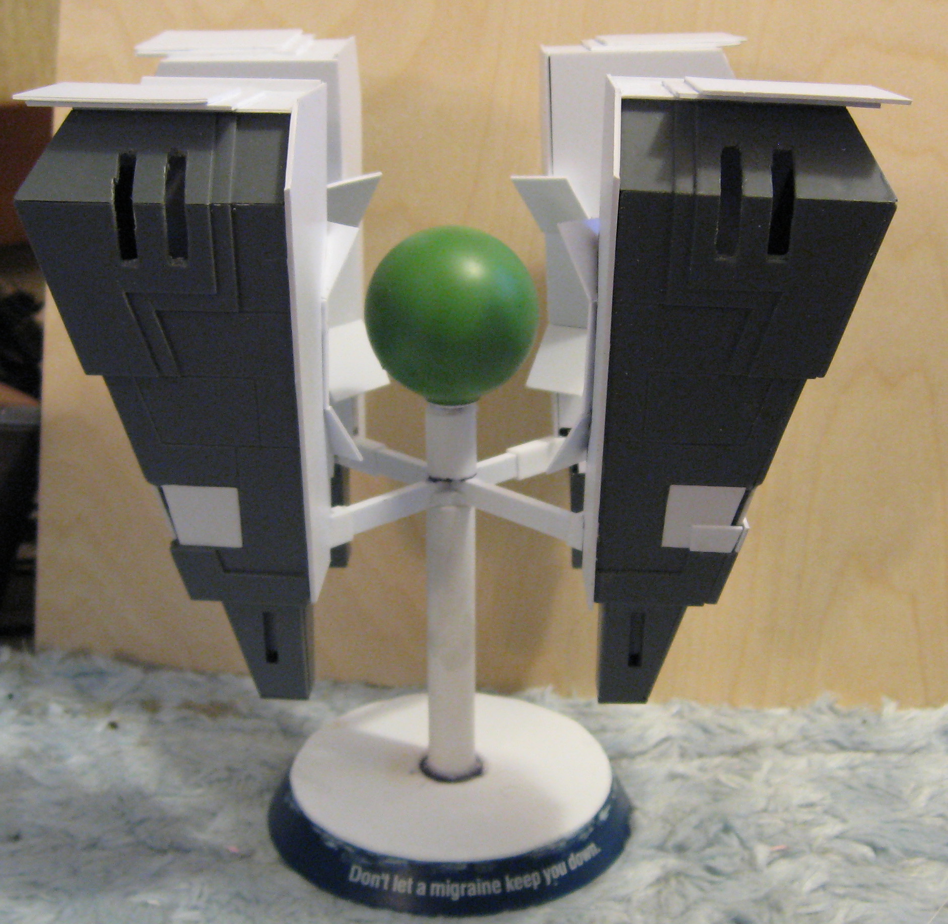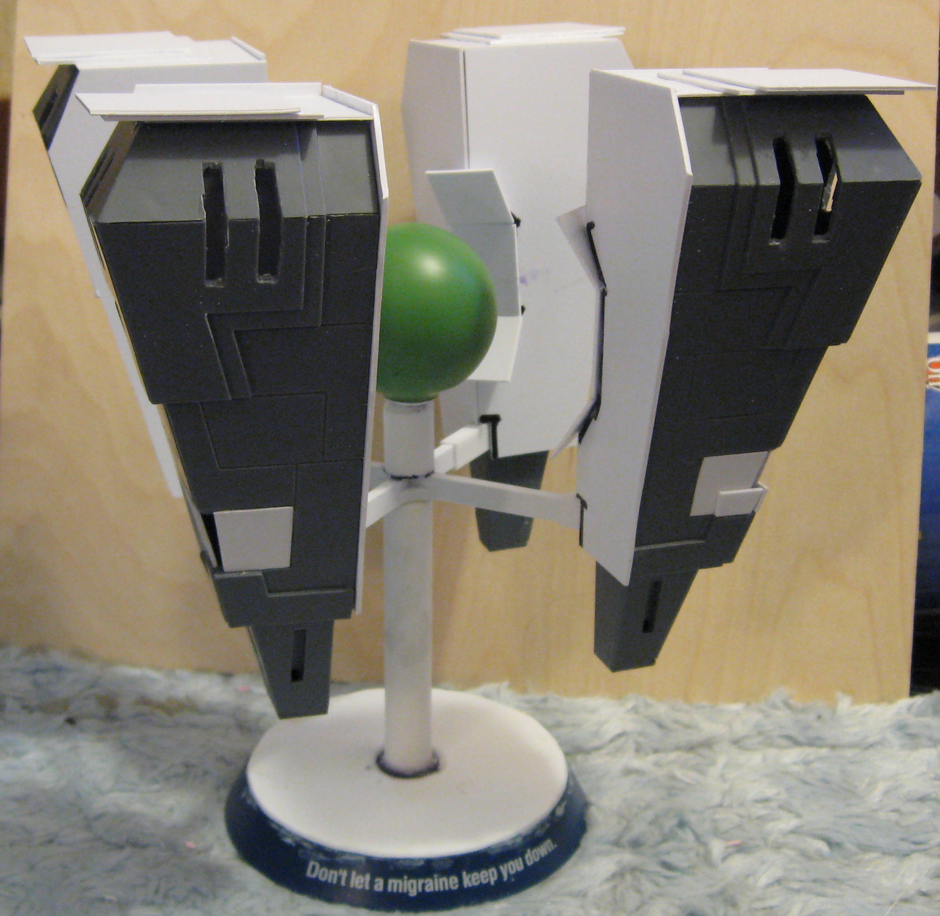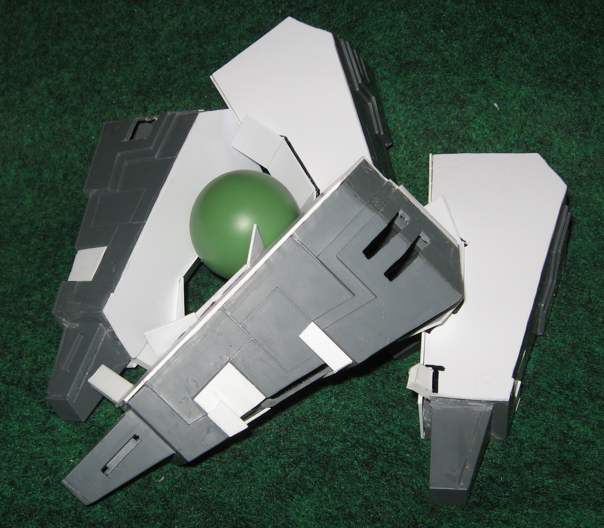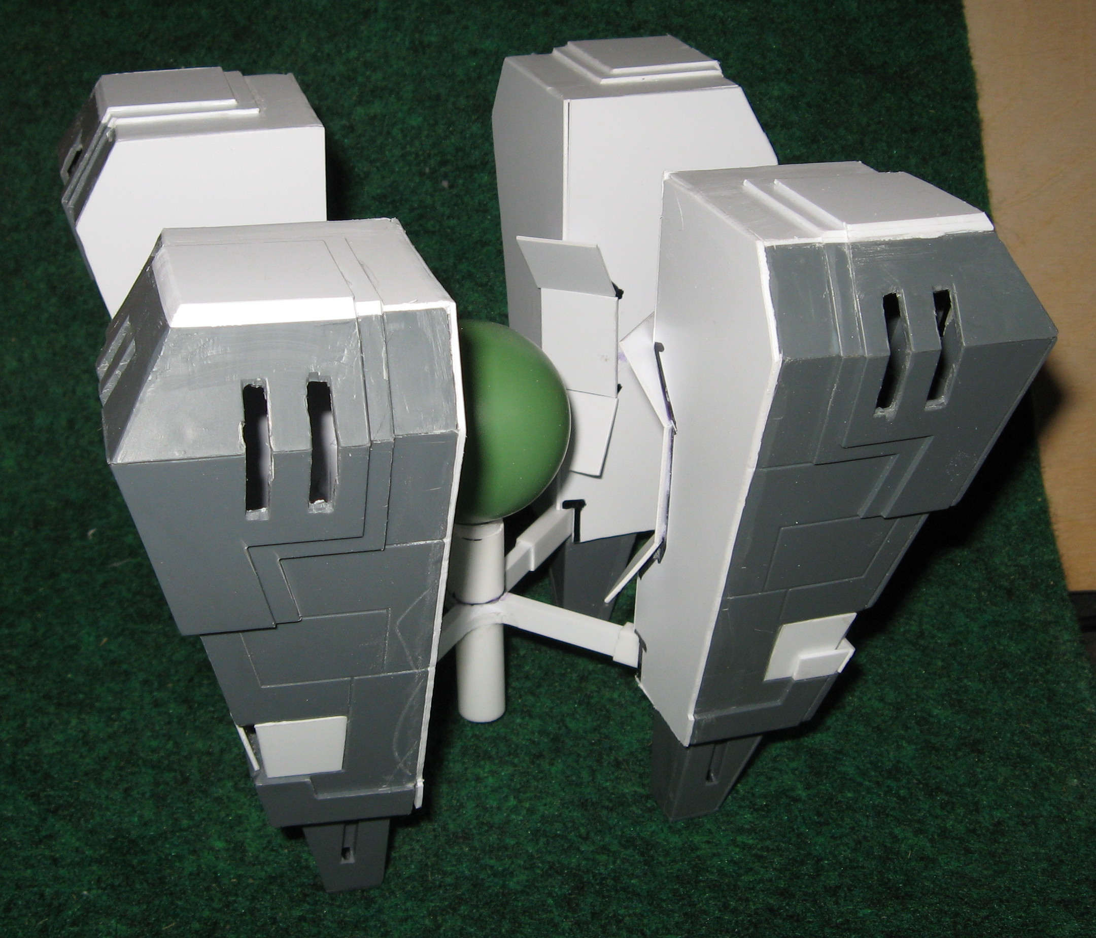 I've got all the main paneling on it. Let the glue dry up good overnight (plus it's past my bed time) and I'll grind down the plasticard where it sticks out so it's all flush more. It will still be lacking some of the details and trim I want to get done, such as all the green rods, but I'm going to call it "assembled" for now. One thing I'm up in the air on right now, is the panels on the inside around the central orb. I originally planned to grind those down flush (a square and two triangles), but seeing it now, I think I may leave it more as is as I kind of dig it.