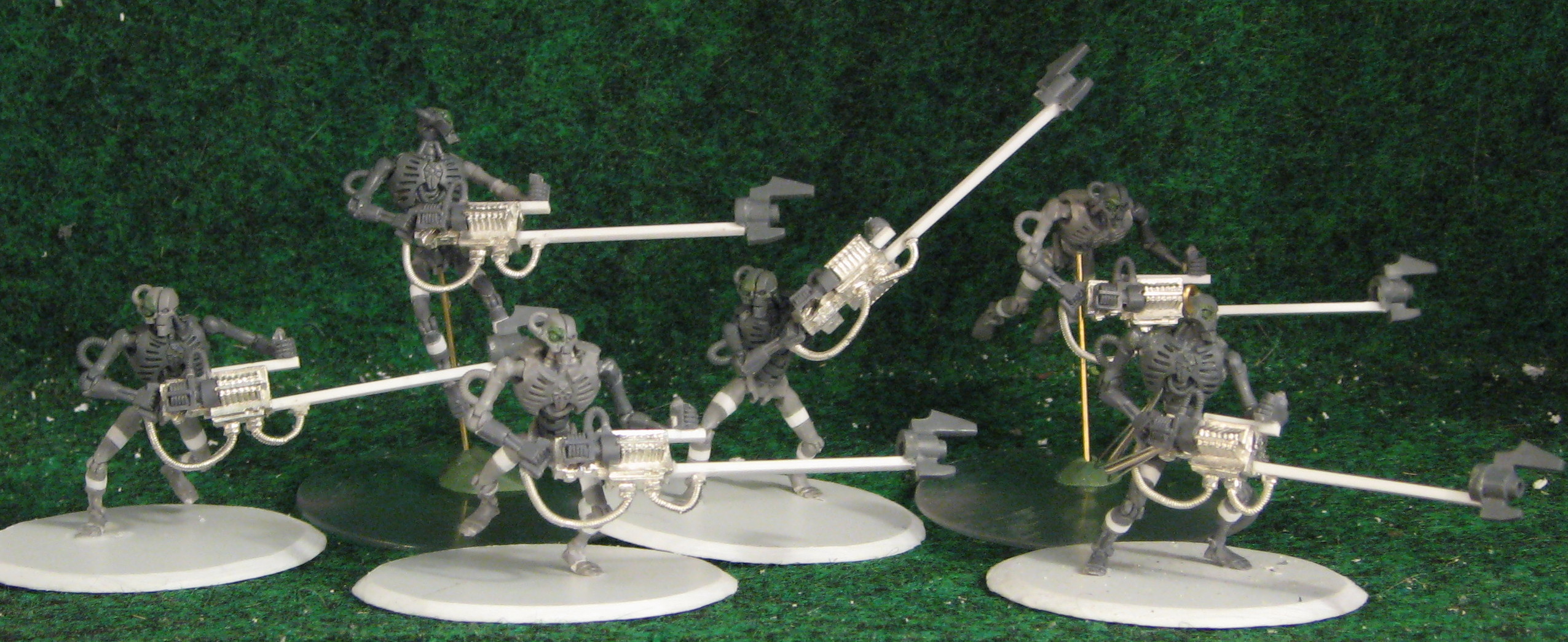 I may be a lazy procrastinator, but once I get busy, I can really get shtuff done. Built all the guns on Thursday. Legs on Saturday. Got em pretty much finished today. Need to stop by the music shop for more guitar string for the wires, and the hobby shop for more plasticard for some more bases tomorrow. The flight packs arn't quite done yet, but I'm not going to be putting those on until the end of the week. They're alot easier to paint that way, and I hope to get some of them done before the tourny. Now I need to finish a unit of 5 normal Destroyers.