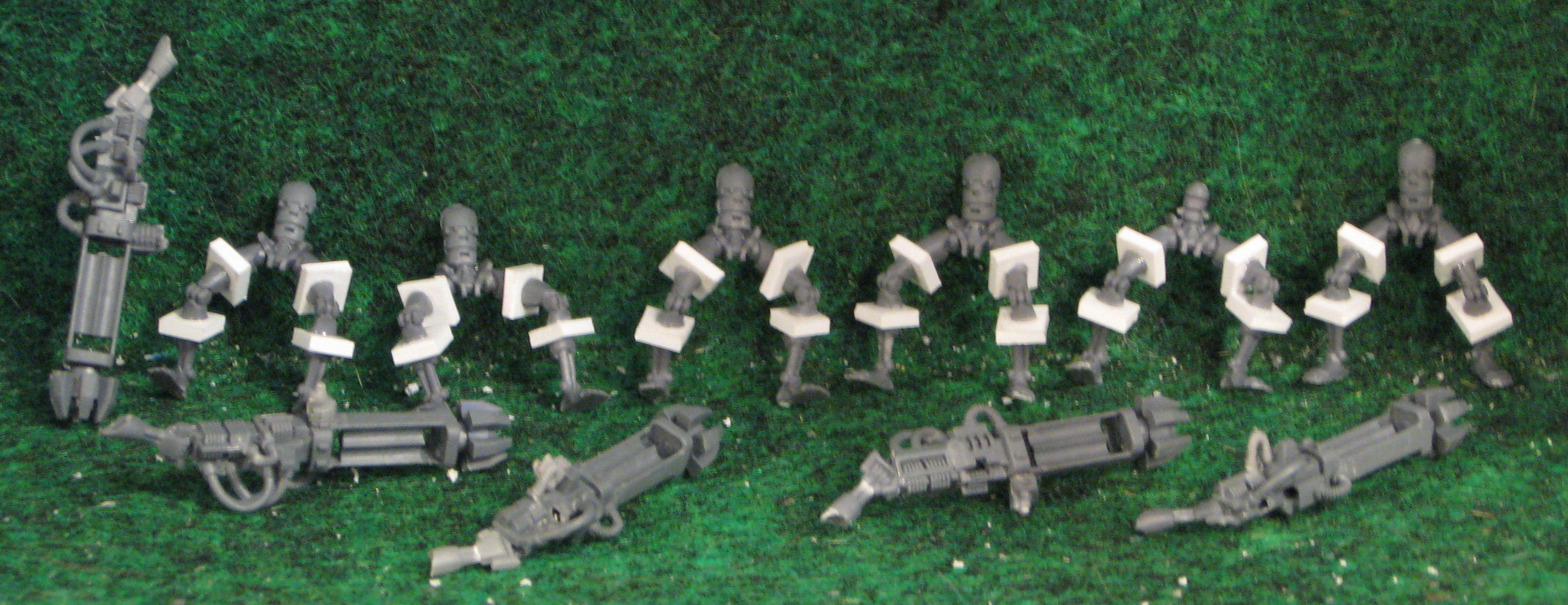 Because it occurs to me that I've pretty much only done finished pics on the Destroyers, here's a WIP shot of my current batch, which so far just consists of their legs and guns. The guns are all built, including the hands that hold it. The legs I'm giving Testors Plastic Cement another shot at, so they're going to be given ~18 hours or so to get all set up and hopefully hold better than it's been, then I'll dremel down the plasicard flush to the legs.