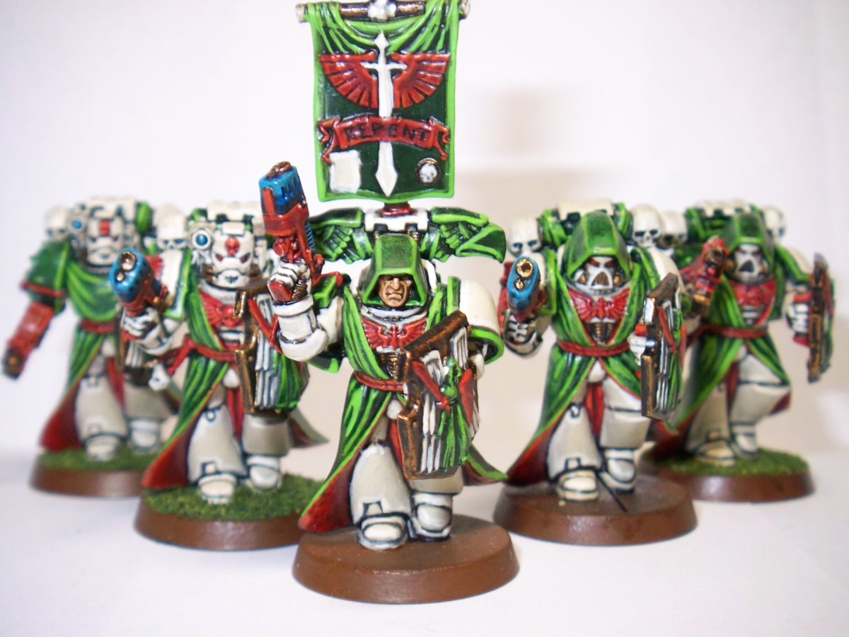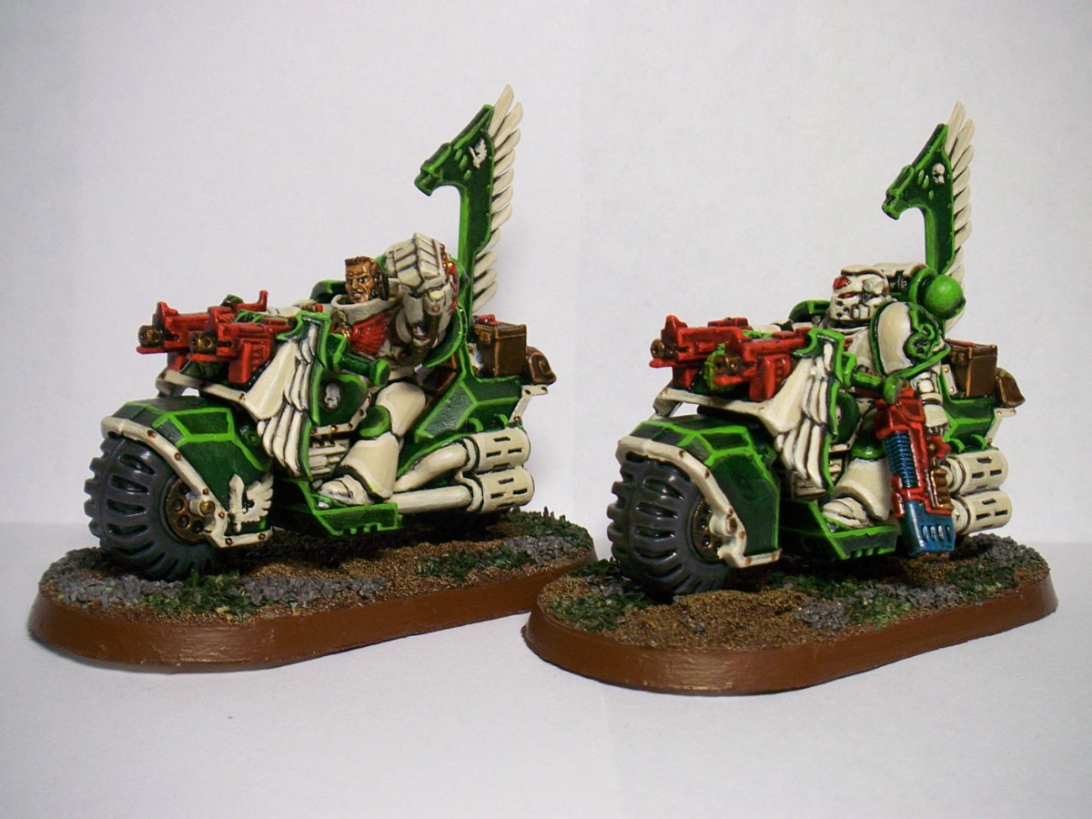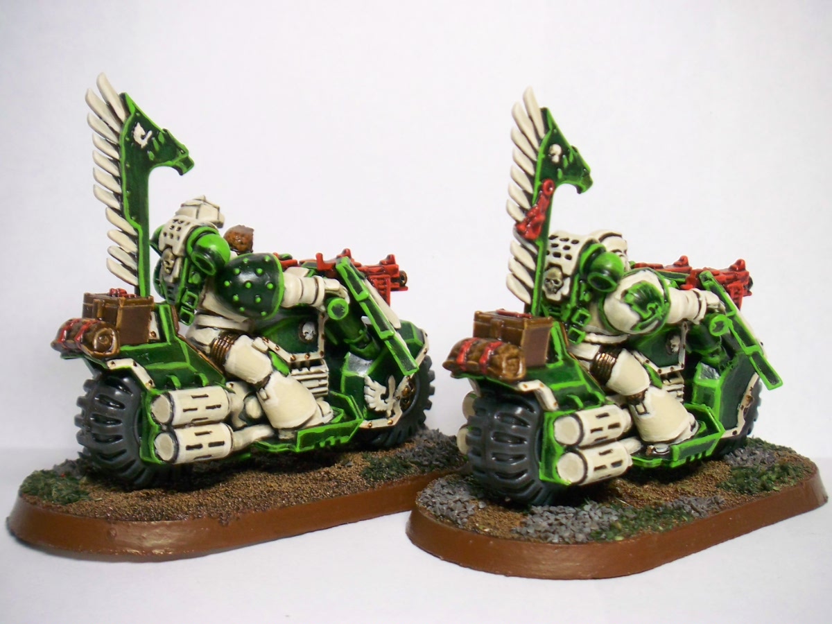 Love the painting , makes the robes look like velvet. Great work all round . Although I'm a traditionalist and think the armour should be dark green and only termies bone white . I know one day I'll get athsma from too much fluff. And if the bikes are not black then they can't be part of the ravenwing , in the old rules they wouldn't get the advantage of being an expert rider , ( can't remember the rule now, its late and I just finished a 12 hour shift) . I don't think thats in the new rules though . Hey vanilla is the new black !