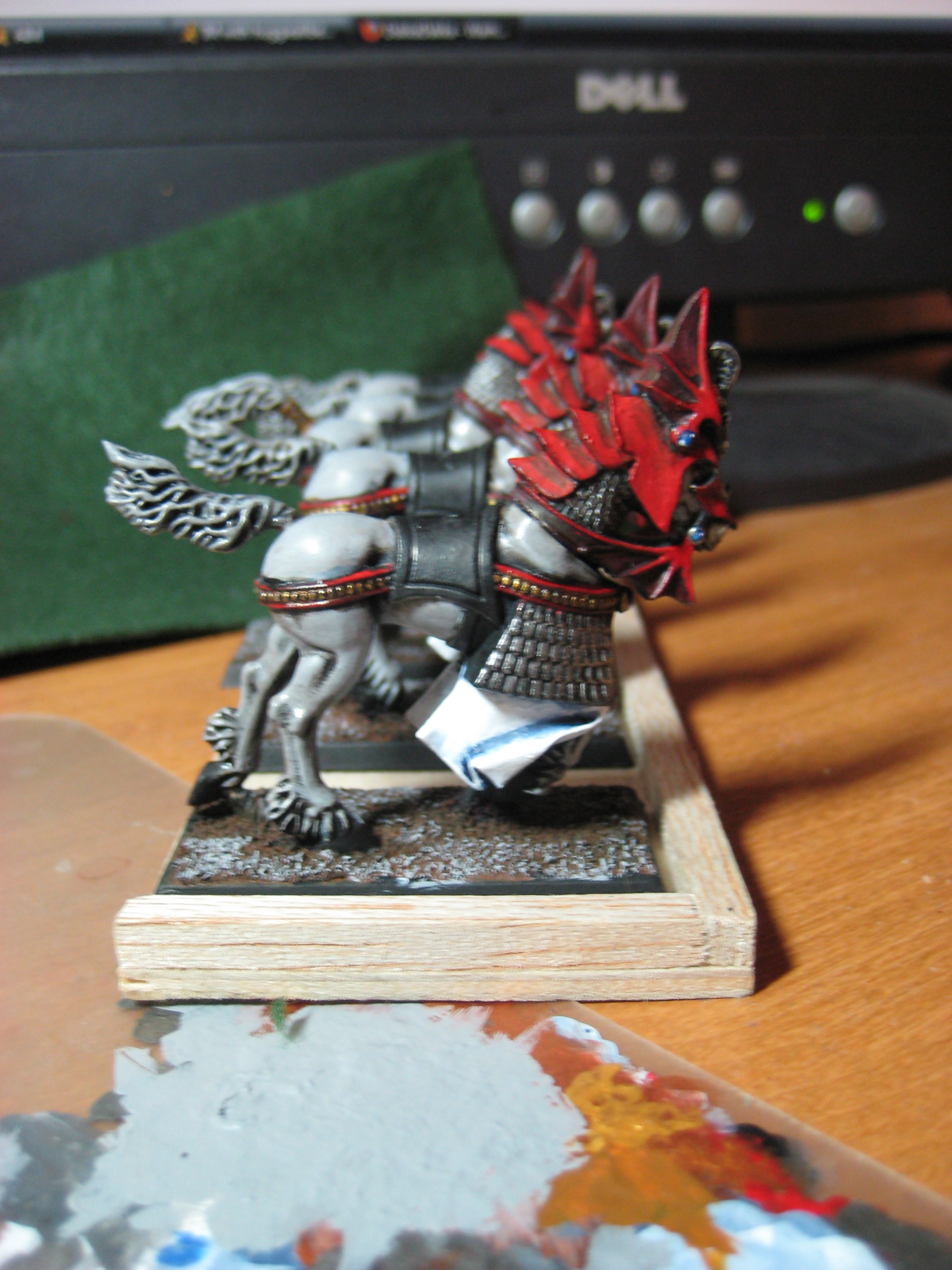 @malf: Honestly, I'm not doing much more past that myself. I pretty much just put a base-coat of about 1:2 Chaos Black:Fortress Grey over the horse, heavy wash with Badab Black and dry-brushed with Fortress gray. I'm probably going to have to do another wash/highlight, though.
