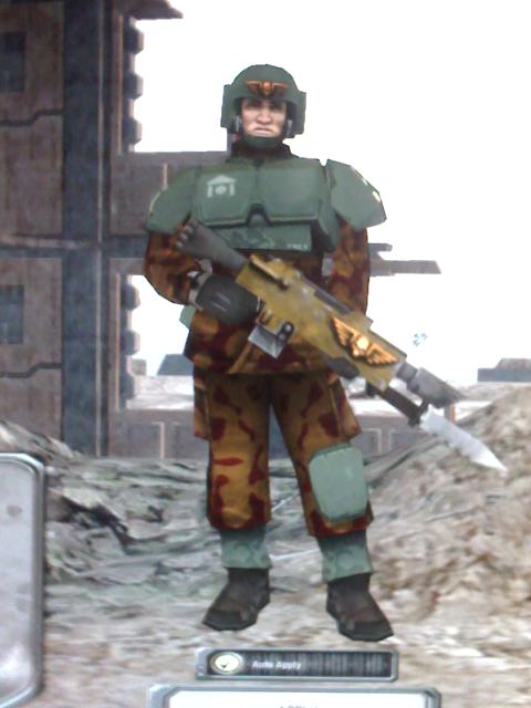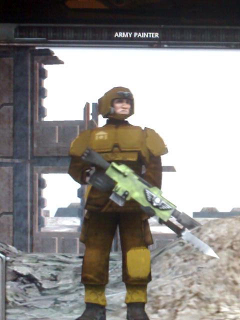 very good guardsman, nice touch with the bolter, the paint jobs up to u, what do you want ur Guard regiment to come from, forgeworld, dessert, forest, hive, it goes on so paint ot what you want them to usually fight on, like my regiment comes from a dessert world in a sytem with a forge world so they are high tech dessert radiers with a camo of brown (rocks) and yellow(sand) and i have a story behind the regiment so yeah, it depends on what you like painting and what ur regiment comes from so yeah