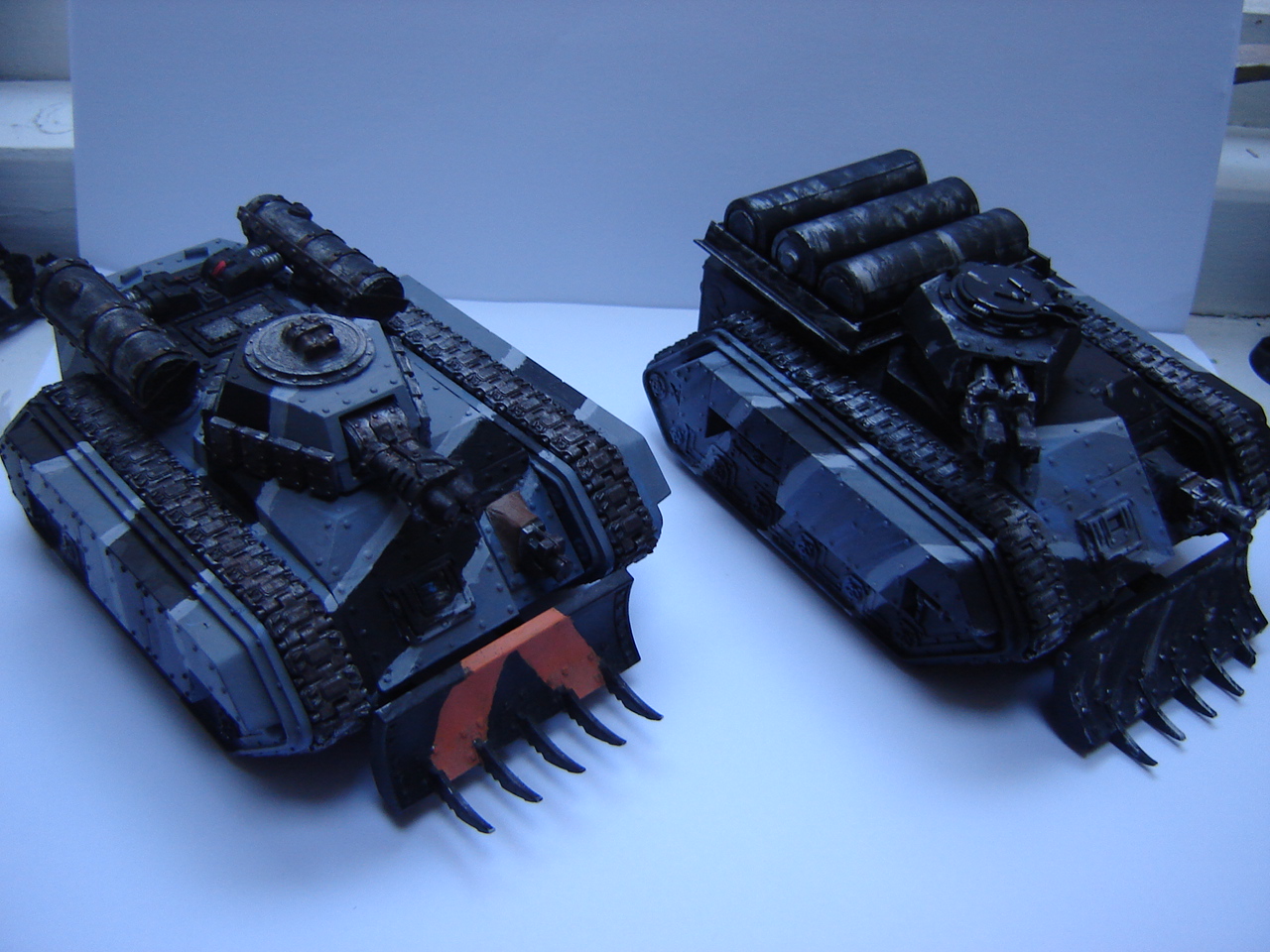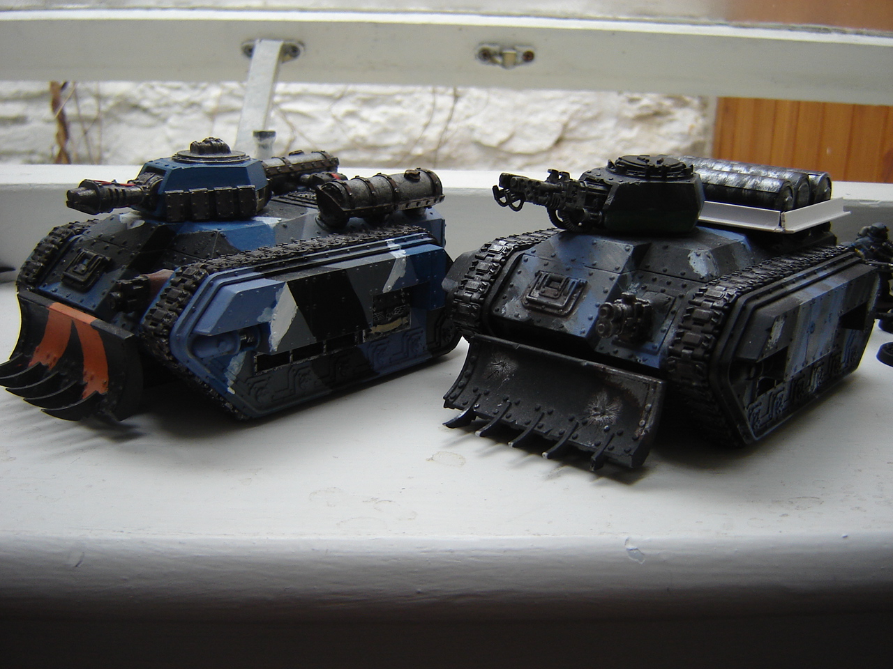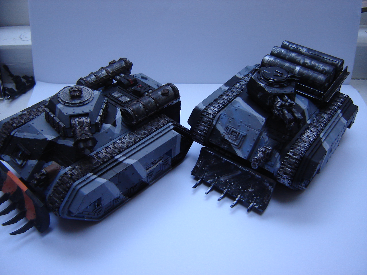 Here are the hellhounds, finally looking good after many years of neglect!! What colour should I paint the orange and black dozer blade?