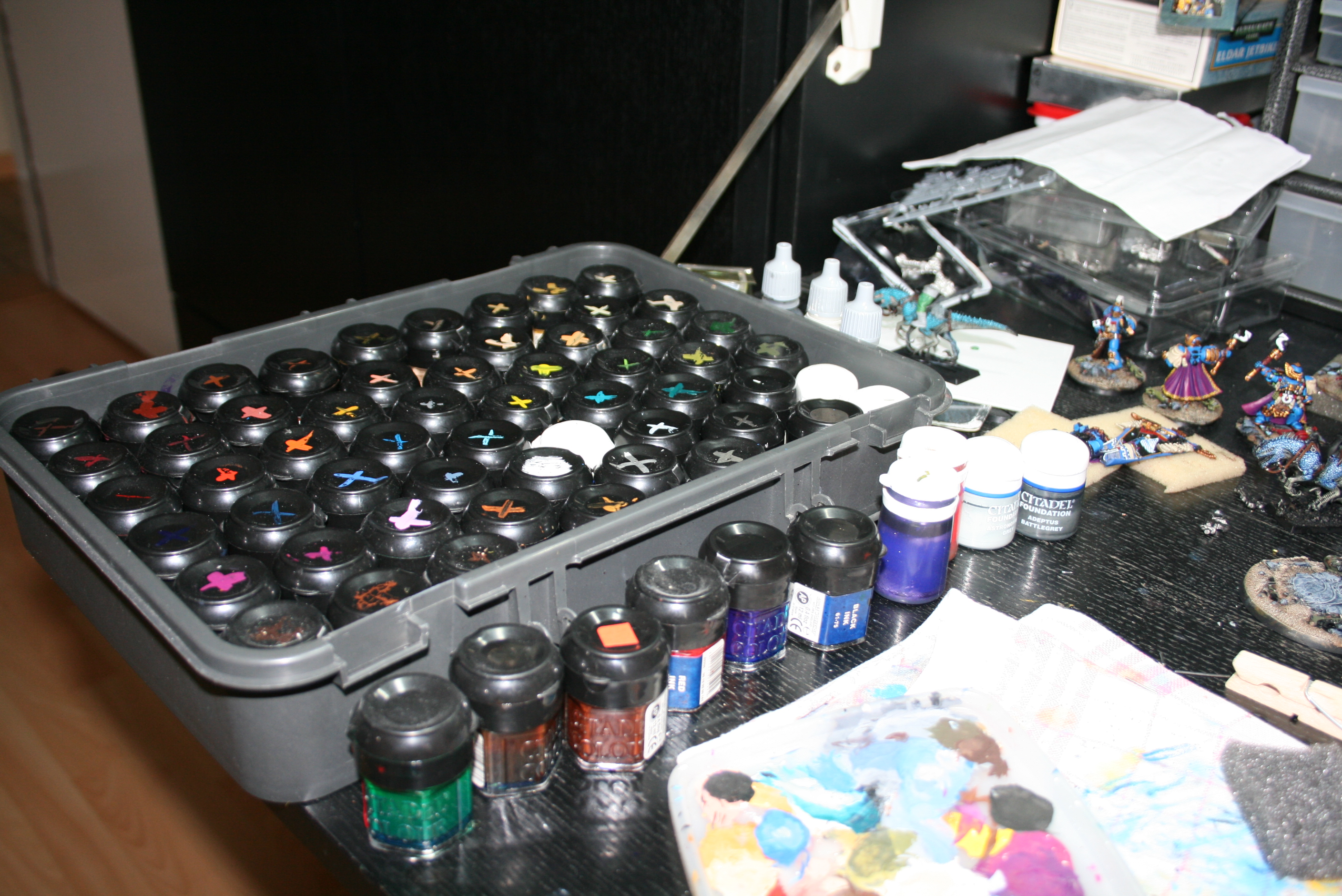 I've got all my paints and brushes located in an old GW cardboard box. Each paint lid has a small dab of paint on the top, so I can easily pick the color I need. I try to keep them somewhat organized within the box, but that doesn't happen often.