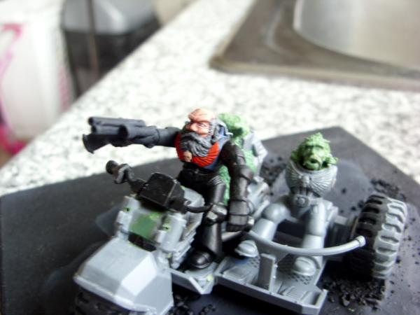I have extendend his arms a little to bring them in proportion with his head. I'm hoping that he just looks like a big ass biker. Heres some more pics for you, do you like the custom made double barreled boltgun?]