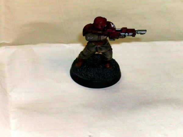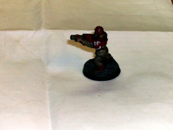 Following quite a few people's suggestions I did unit markings and put white on the eagles on the lasguns in white on the models I finished today. I'll put pictures up as soon as I can track down the camera I was using. Automatically Appended Next Post: As promised, progress for today. For unit markings I didn't want to do Arabic or Roman numerals because they're overdone and I find them boring, so instead I did Hindu numbers, so my army could be different. I also went and painted the eagles on the lasguns and grenade launcher white, which worked well, so I'll be doing it on all models from now on and going back and doing it on the squad I finished already.