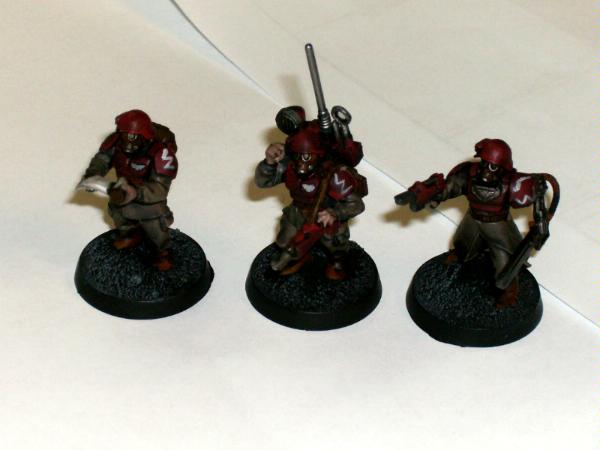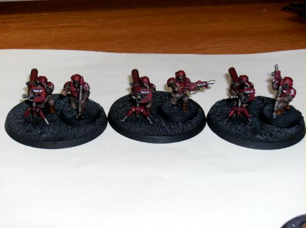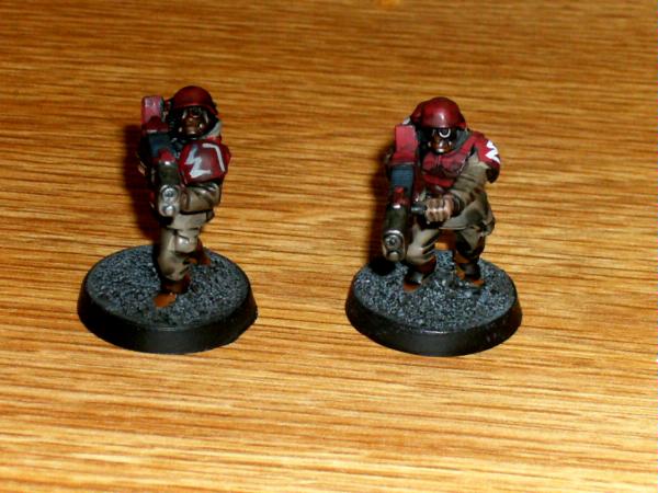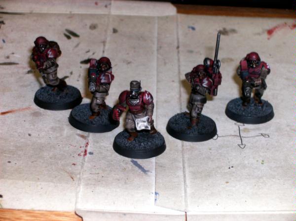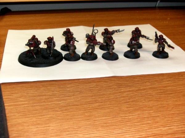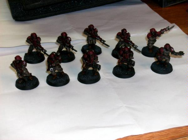 The Veteran Squad that is the rest of my infantry for my first 1000 points of Guard. They're meant to be the assault part of the force so everyone who doesn't have a flamer has a bayonet. I'm trying to figure out how to appropriately represent their status and I'm thinking about camo fatigues for right now. Shouldn't be too hard to pull off but any other suggestions are very welcome.