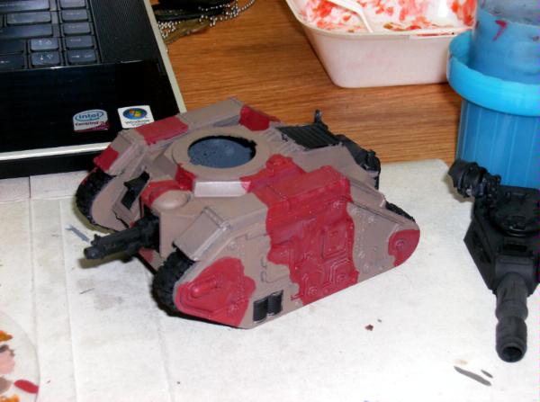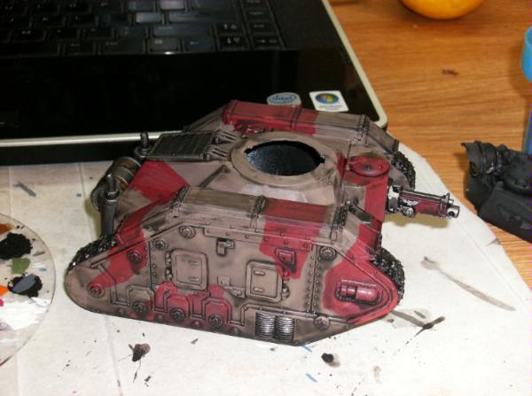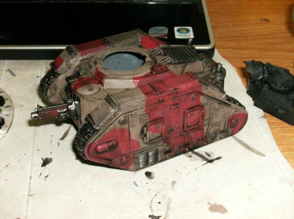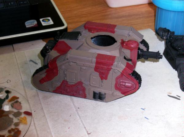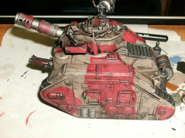 So in a rush to complete my June vows I've started putting the basecoats on my Leman Russ. The red could use a few more coats, and it needs detail work and cleaning but looking at the paint scheme I'm fairly happy the way it came out, though I'm not 100% sold on it. Any thoughts, comments, or criticism on the paintjob or the camo in general would be greatly appreciated.