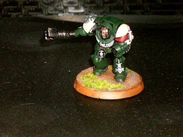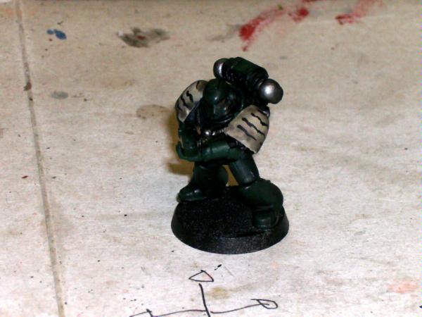 So having finished my Dark Angels successor Deathwing squad I decided to work on some rank and file marines. I converted this guy as best I could in MK4 armor and tried to make it looks like he has devotional scripts on his pauldrons, but I'm not sold on the effect. Any suggestions or comments would be greatly appreciated.